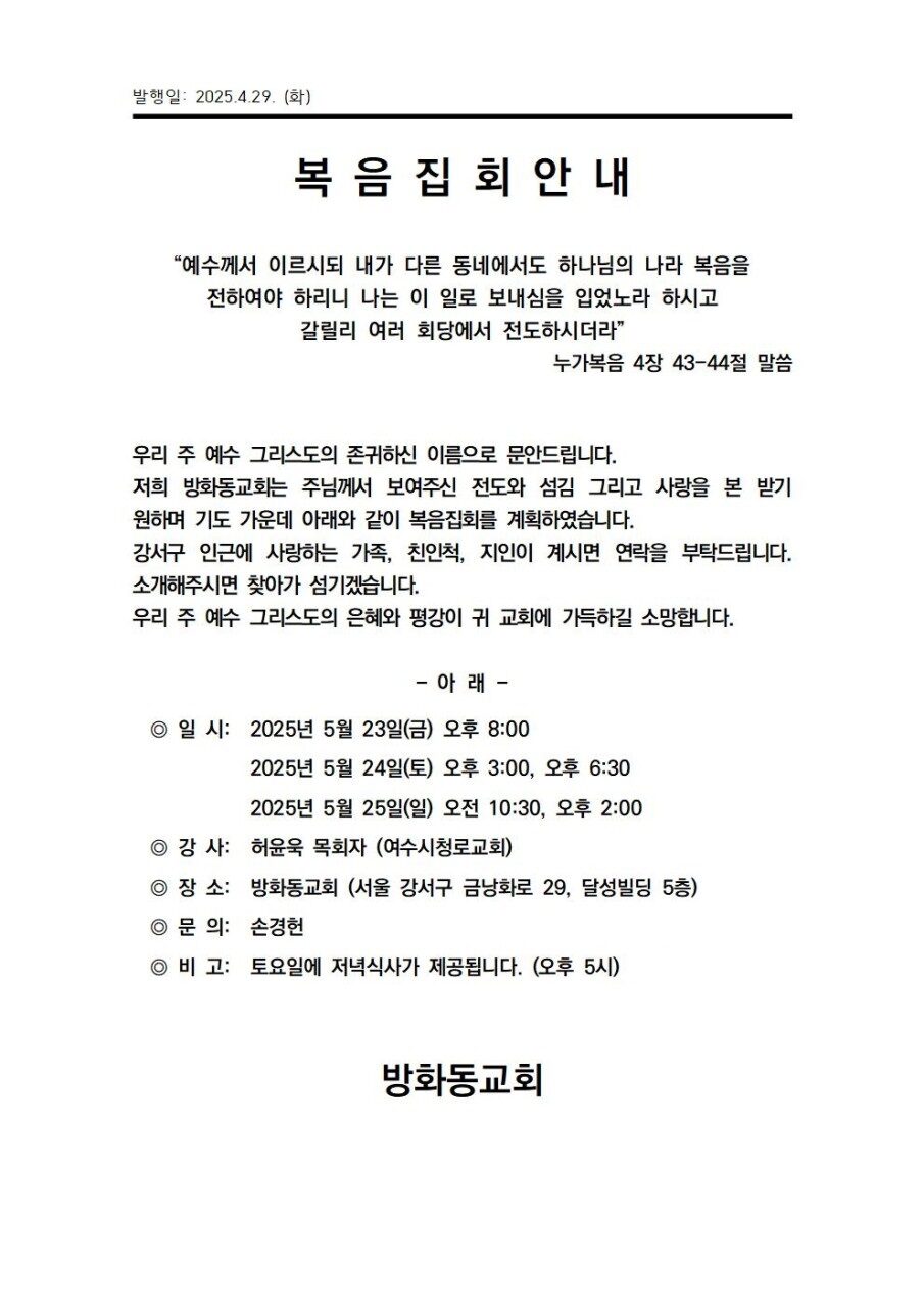[복음집회] 서울 방화동교회 (5월 23-25일)
