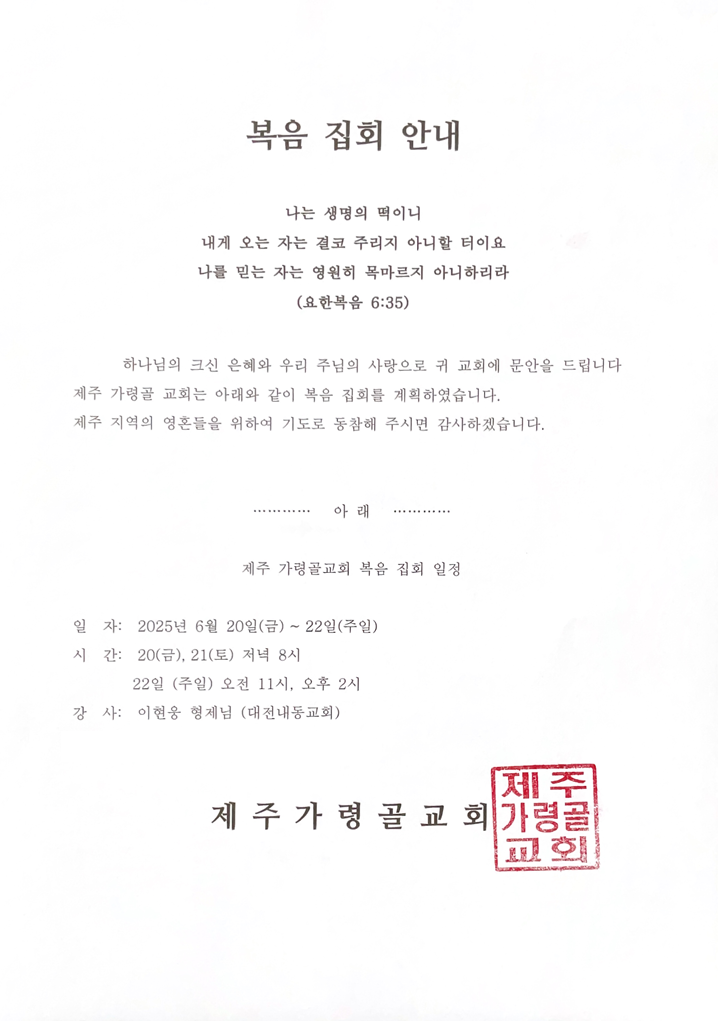 [복음집회] 제주가령골교회 (6월 20-22일)
