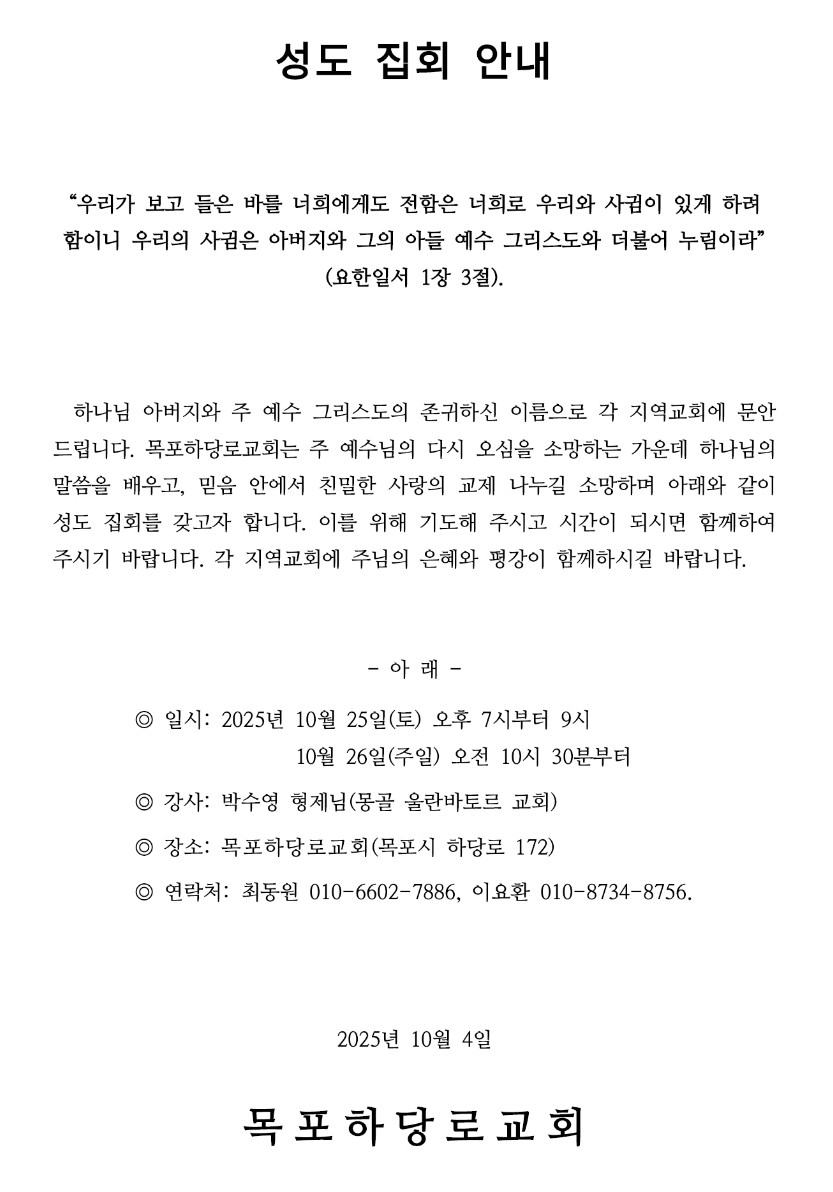 [성도집회] 목포하당로교회 (10월 25-26일)