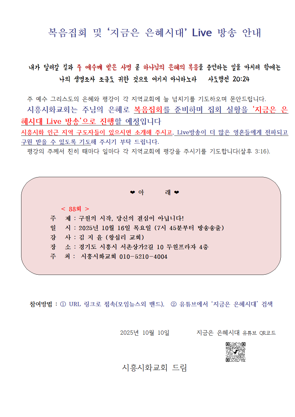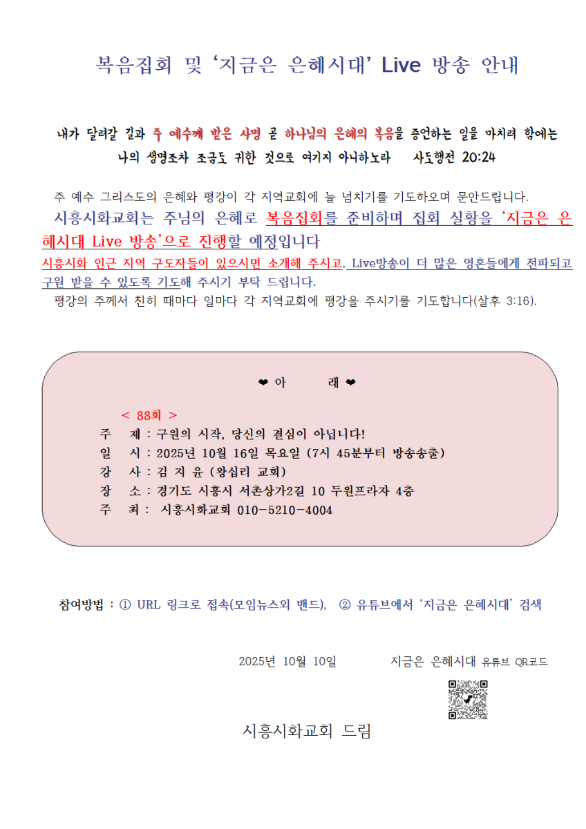 [복음집회] 시흥시화교회_지금은 은혜시대_제 88회 라이브 방송_10월16일