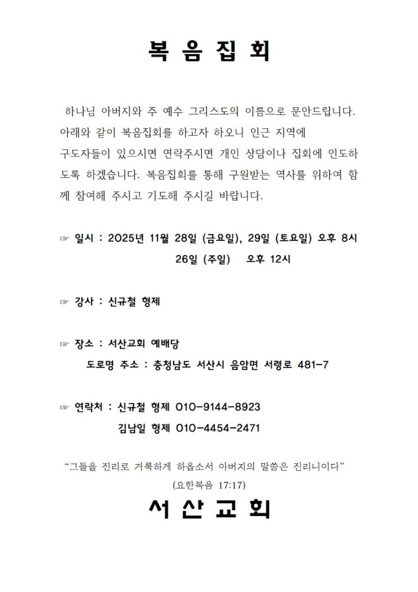 [복음집회] 서산교회 (11월 28-30일)