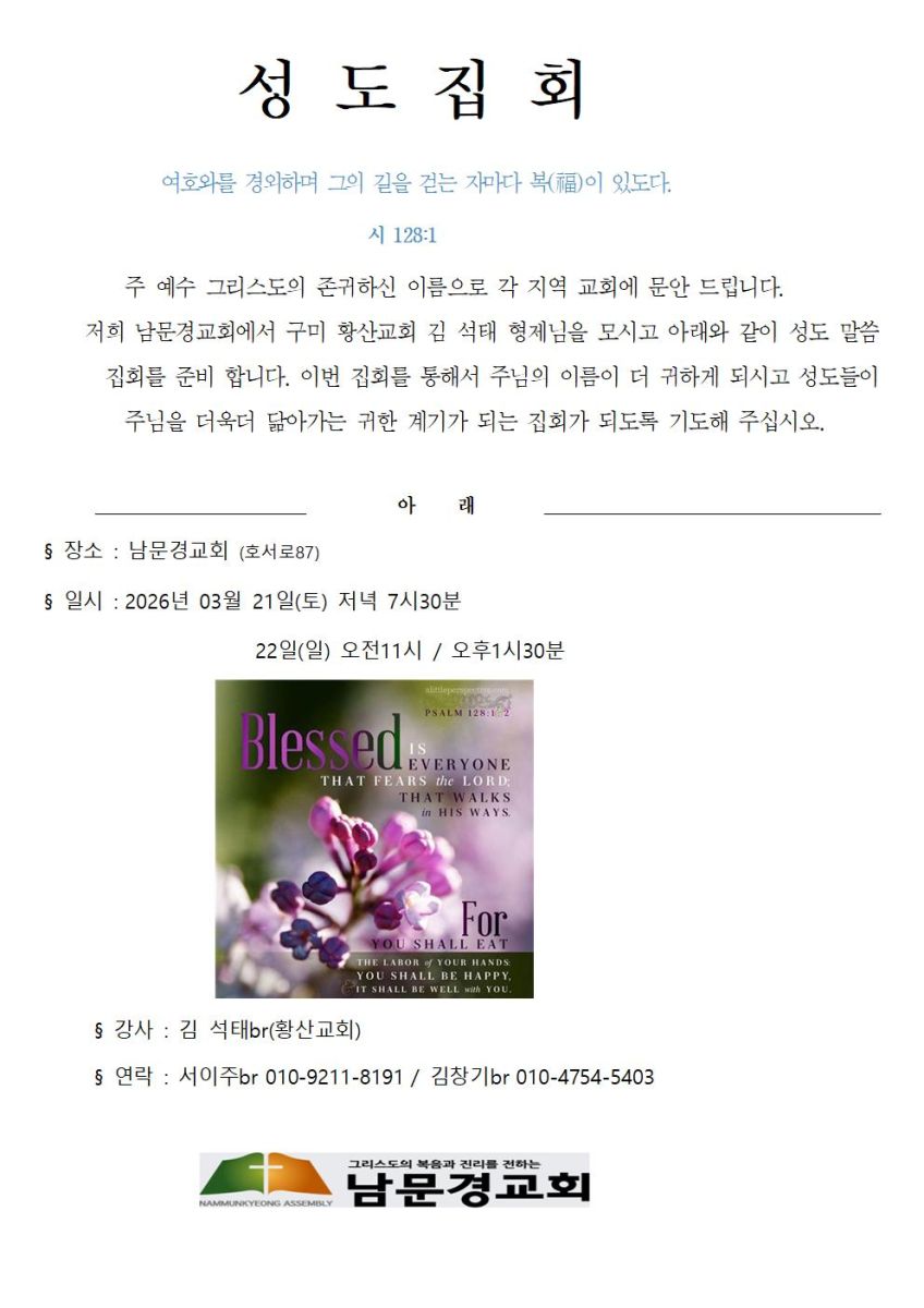 [성도집회] 남문경교회 (3월 21-22일)