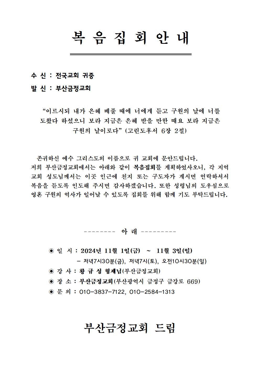 [복음집회] 부산금정교회 복음집회(11월1~3일)