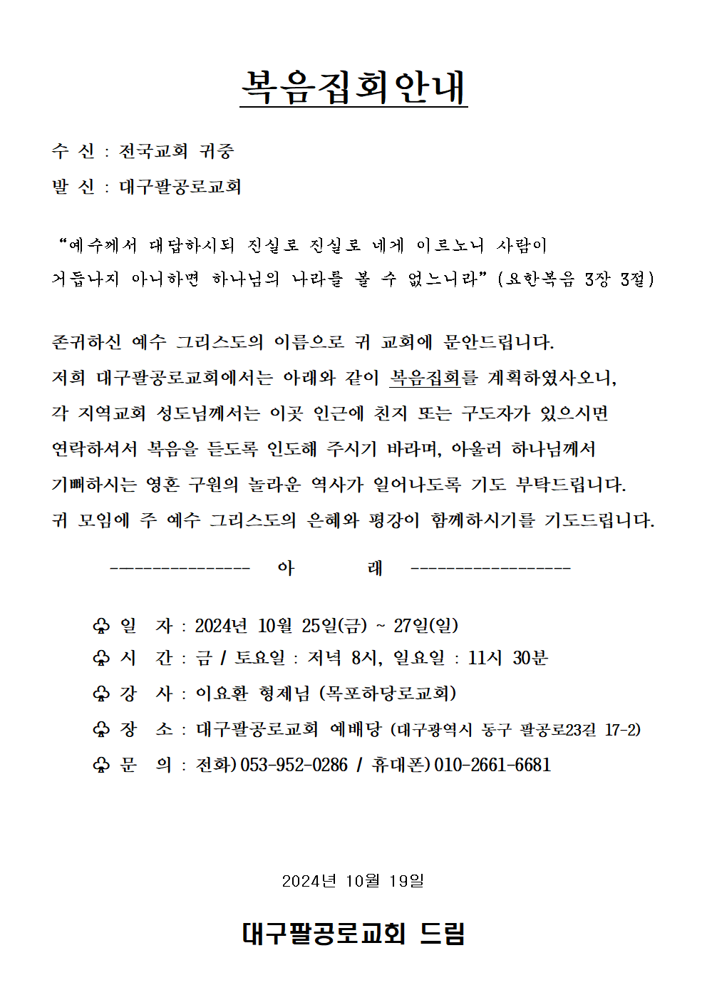 [복음집회] 대구팔공로교회 복음집회(10월25일 ~ 27일)