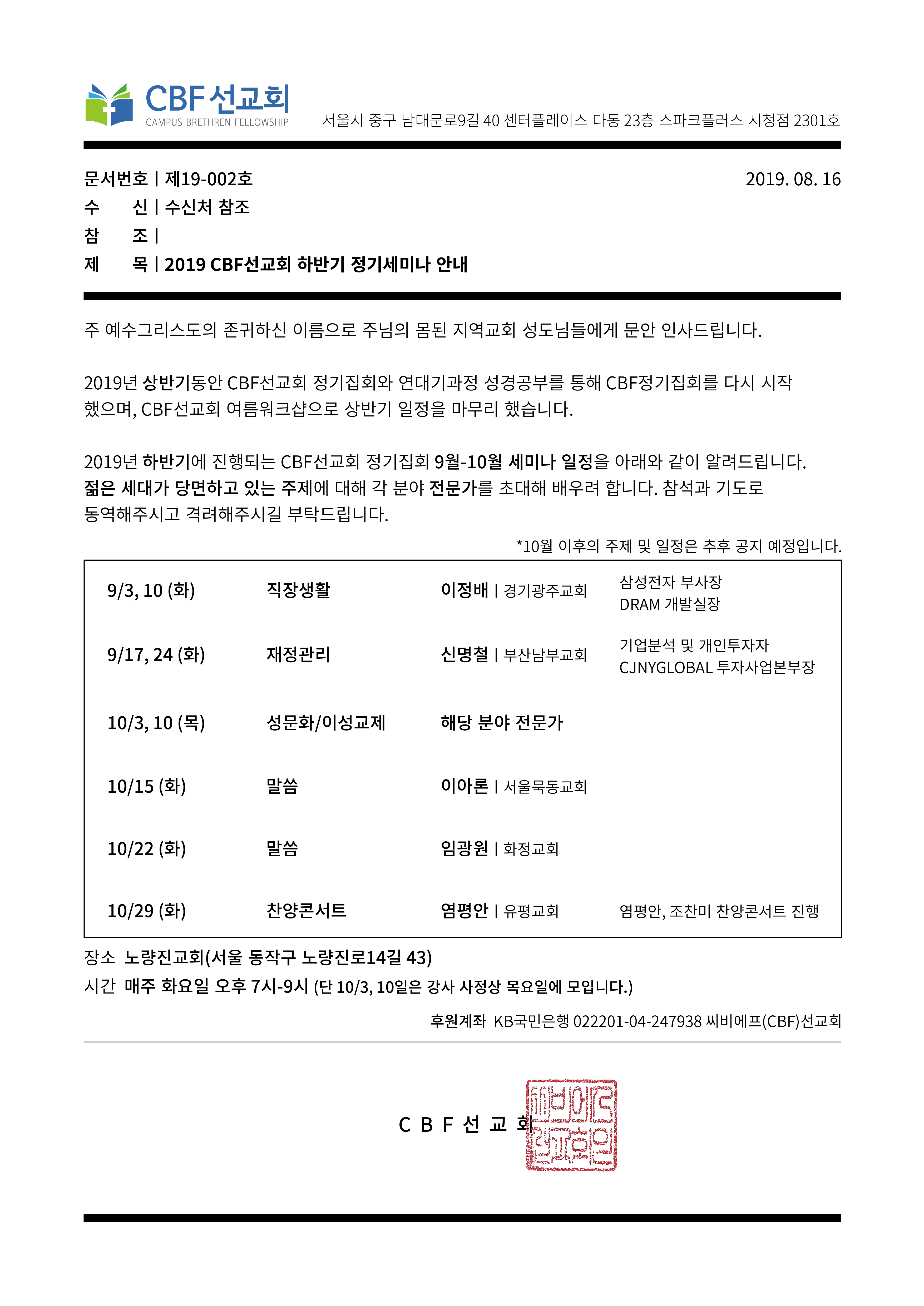 2019년 하반기에 진행되는 CBF선교회 정기집회 9월-10월 세미나 일정을 아래와 같이 알려드립니다.