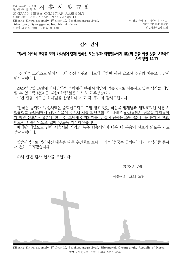 [지역교회] 감사 인사_시흥시화교회 예배당과 방송국 상가 매입에 대하여