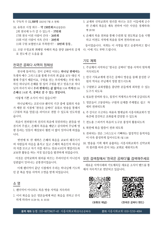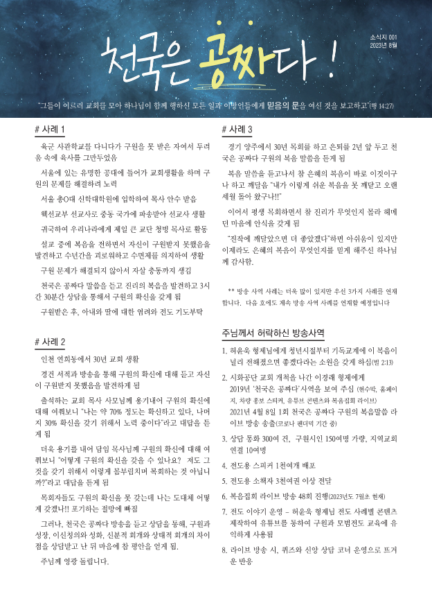 [선교] 2023년 8월 천국은 공짜다 사역 기도 소식지 1호