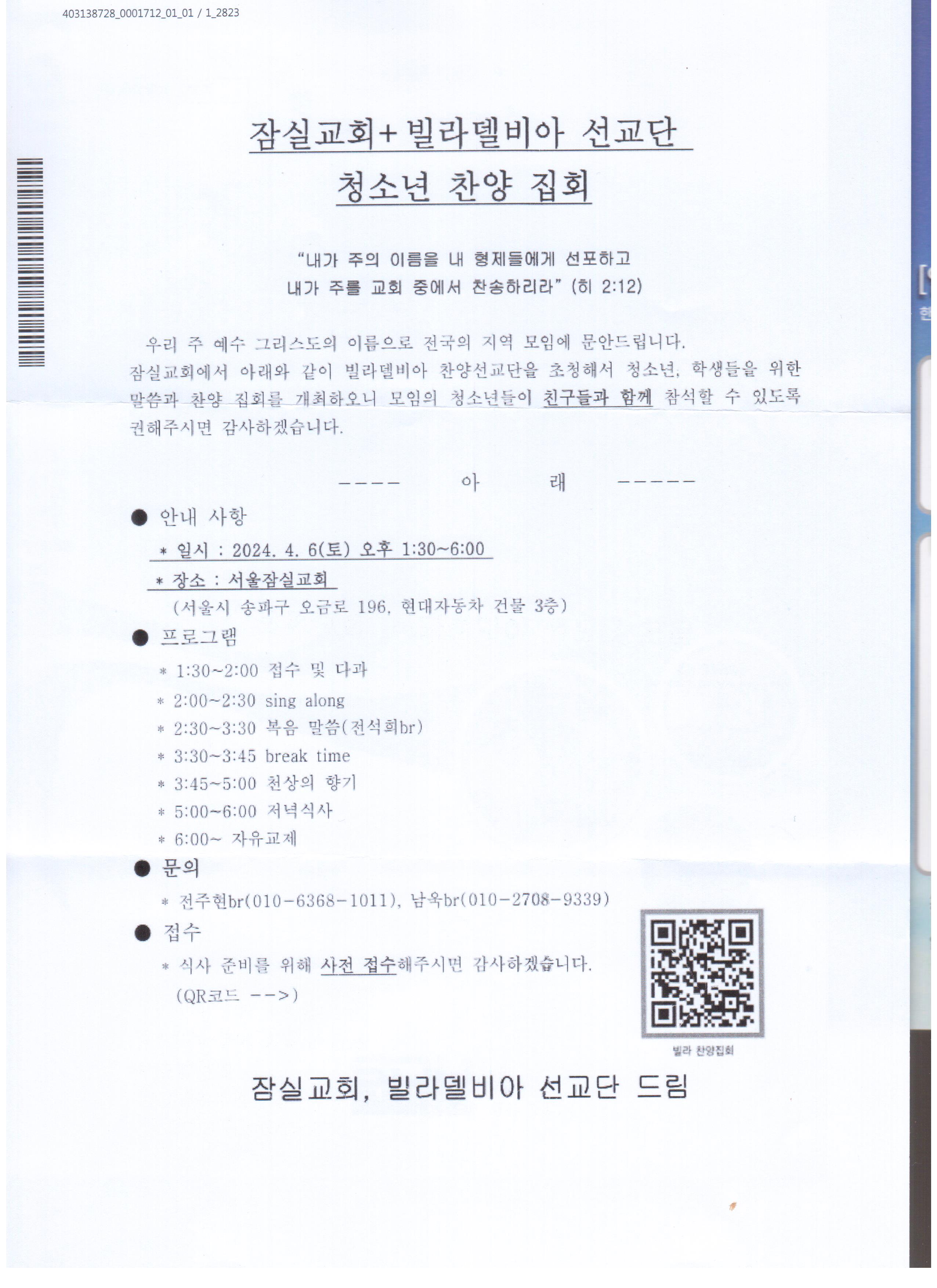 [선교] 잠실교회+빌라델비아 선교단 청소년 찬양집회 (4월 6일)