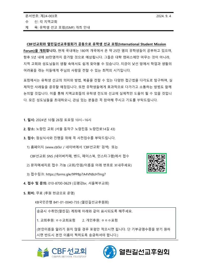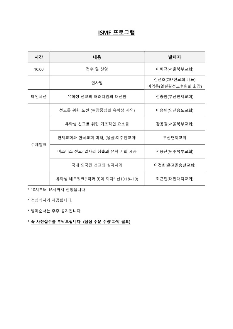 [선교] 유학생 선교 포럼(ISMF) 개최 안내