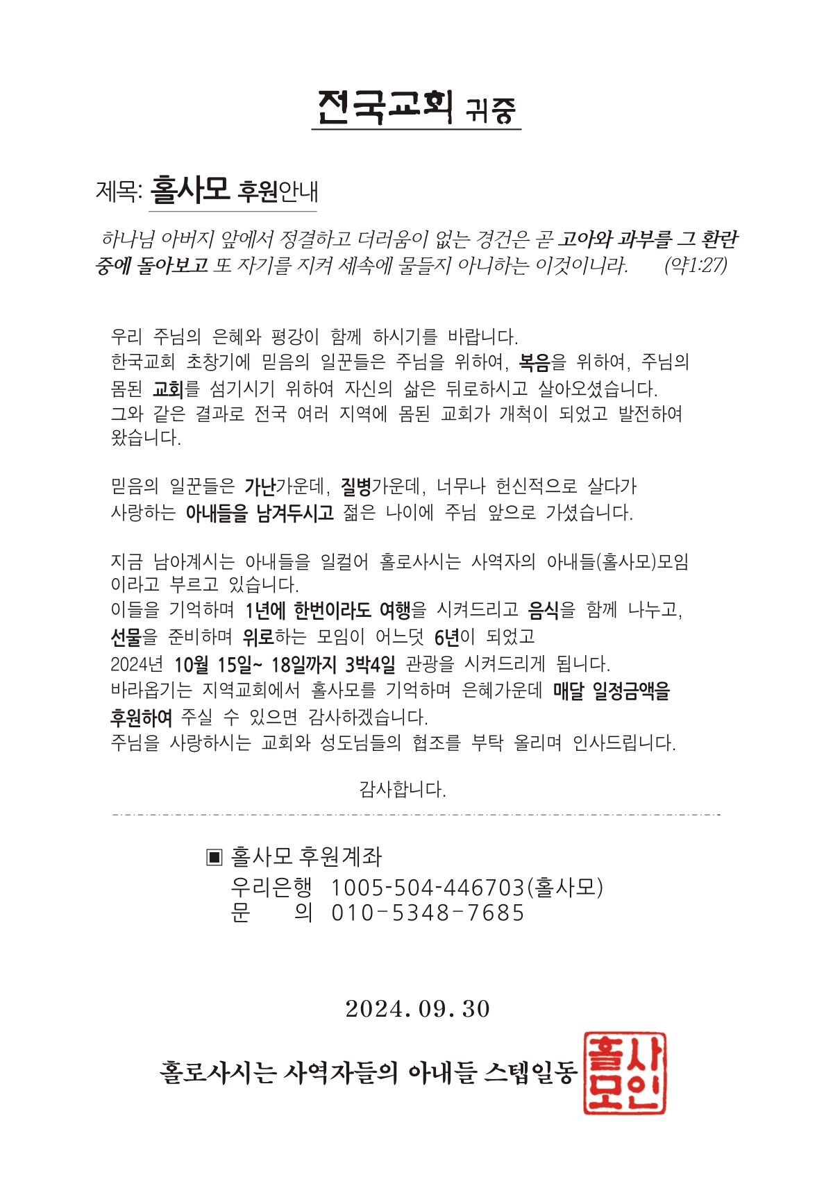 [지역교회] 홀사모 후원안내