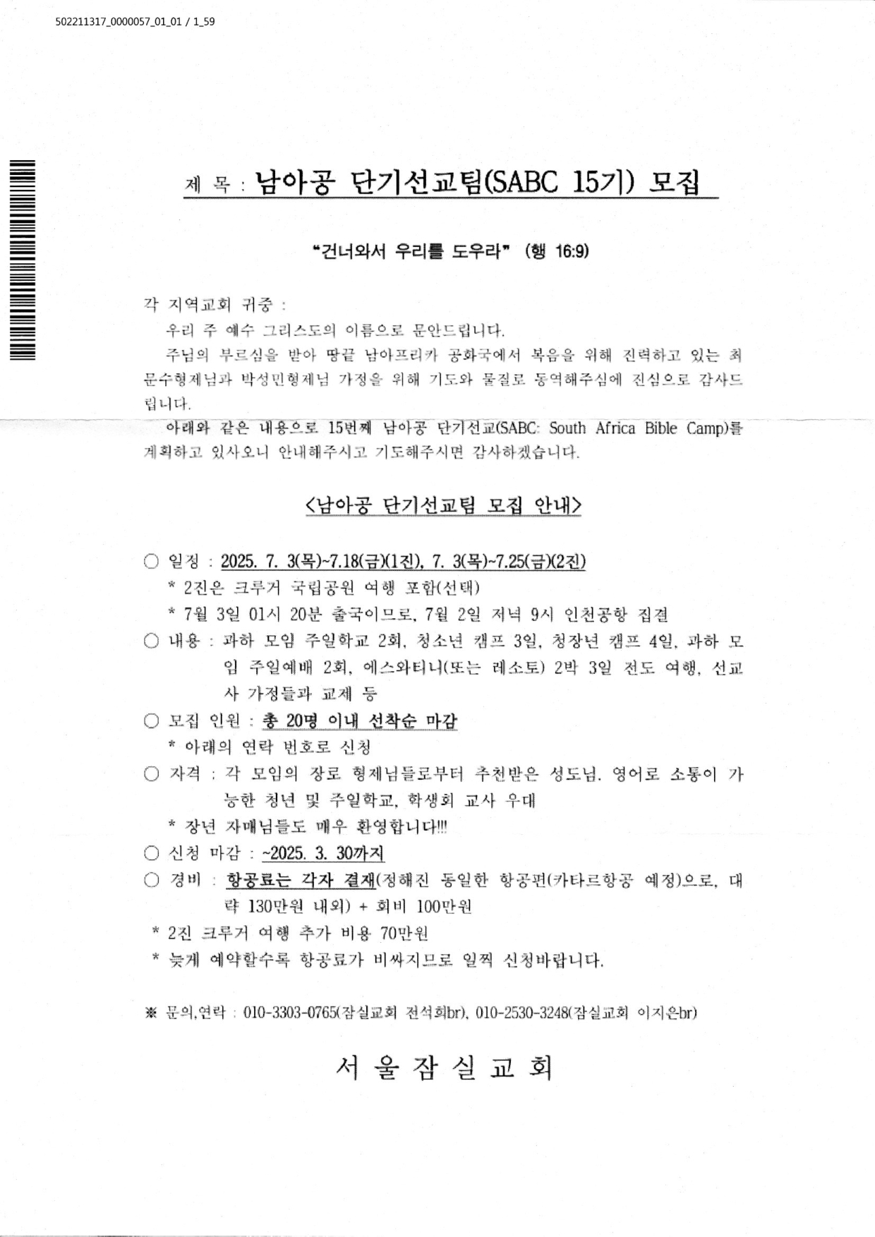 [선교] 남아공 단기선교팀 모집 (7월 3-18일)