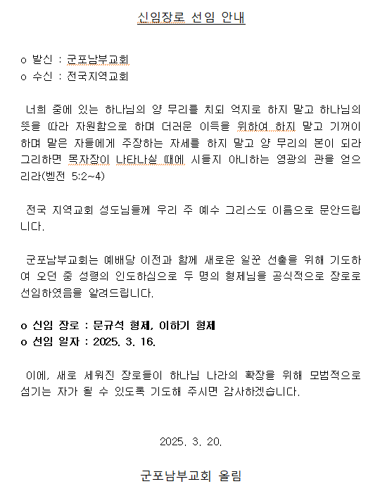[지역교회] 군포남부교회 신임장로 선임 안내