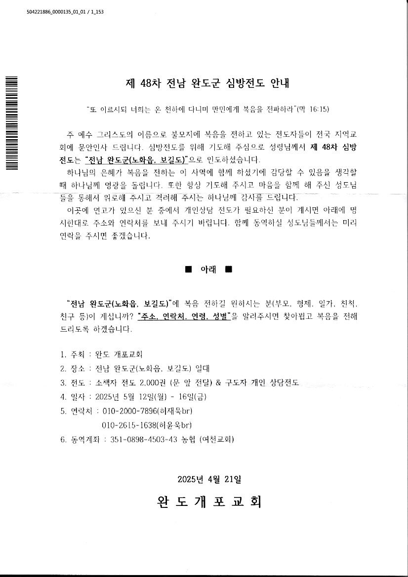 [선교] 전남 완도군 심방전도 (5월 12-16일)