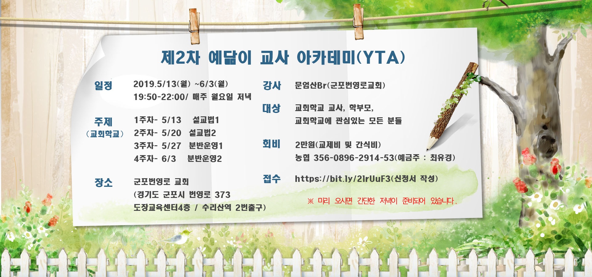 제2차 교사 아카데미가 이틀 앞으로 다가 왔습니다. 아직 접수 못하신 분들 접수해 주시고 기도로 동역부탁드립니다.