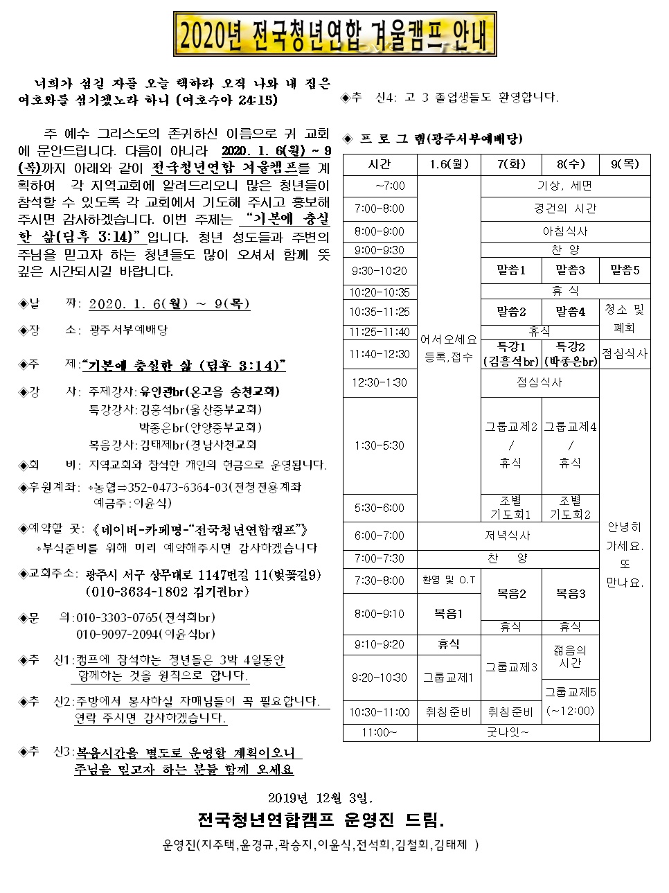 [캠프와 수련회] 2020년 1월 전국청년 연합겨울캠프 공문입니다.