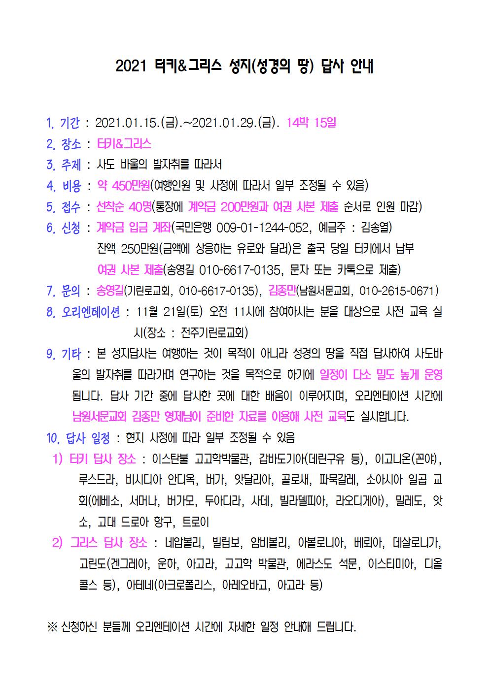 2021 터키&그리스 성지답사를 아래와 같이 추진합니다.