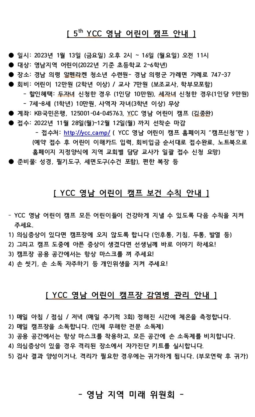 [캠프와 수련회] YCC 5th 영남 어린이 캠프 - 2차 공문