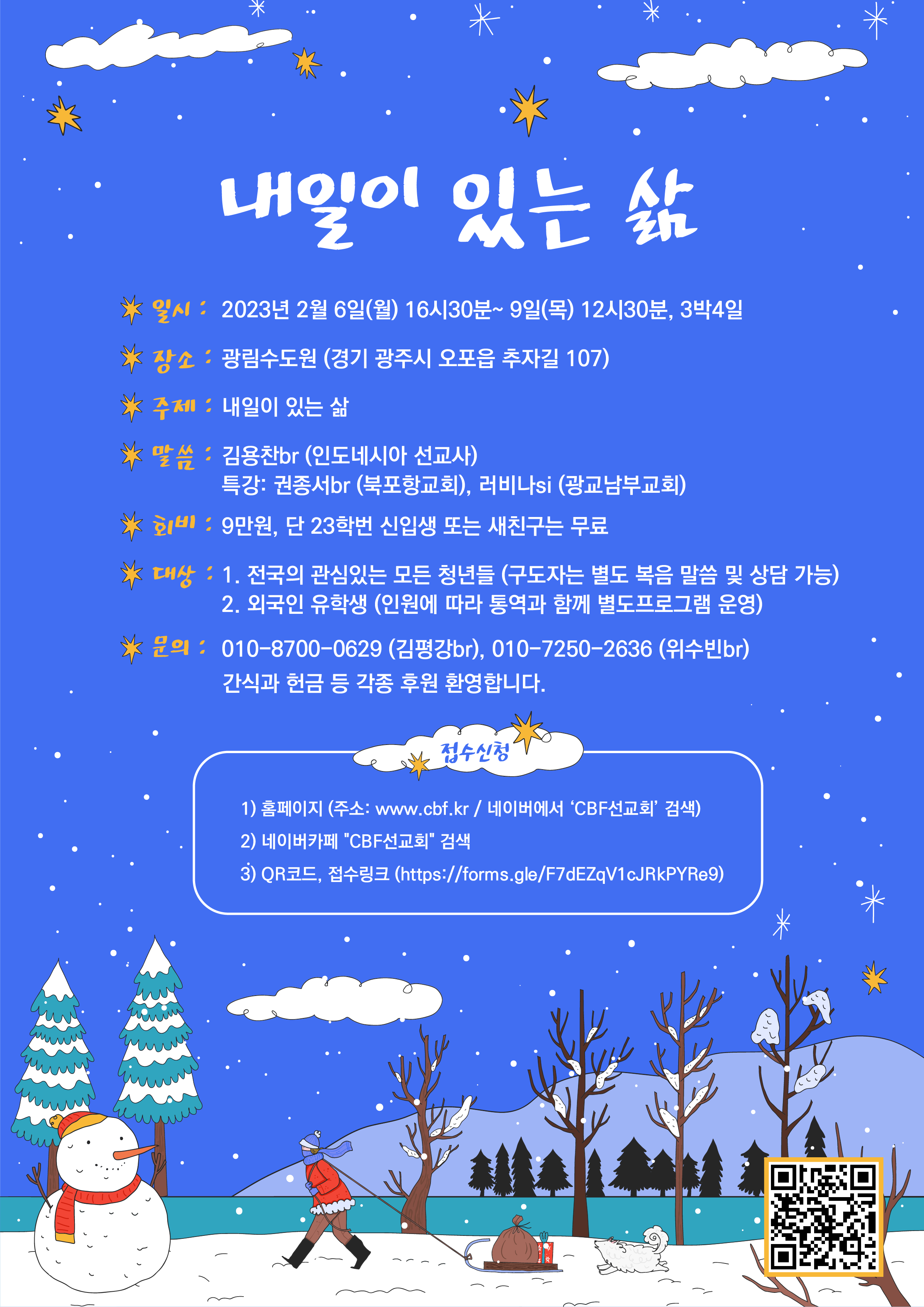 2) 네이버카페 "CBF선교회" 검색 / 3) QR코드, 접수링크 (https://forms.gle/F7dEZqV1cJRkPYRe9)