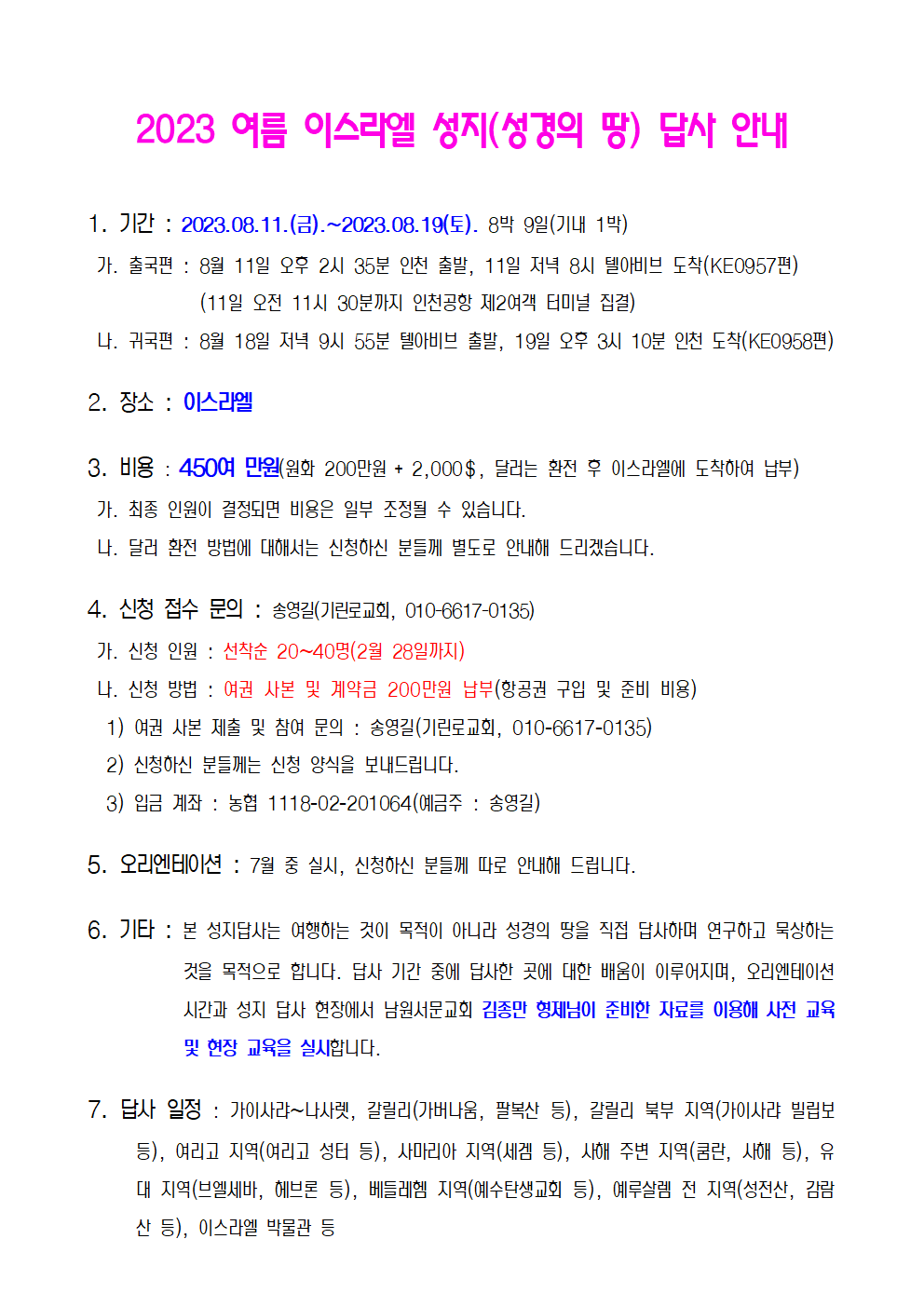 이스라엘 성지답사를 가고자 하셨으나 시기와 기간이 맞지 않았던 분들을 위해 여름에 성지답사를 아래와 같이 계획하게 되었습니다. 중간에 8월 15일이 휴일이어서 직장인들도 1주일 여름 휴가를 내시면 참여가 가능하십니다. 1차로 2월 28일까지 선착순 모집하니 관심 있으신 성도님들의 신청 부탁드립니다.