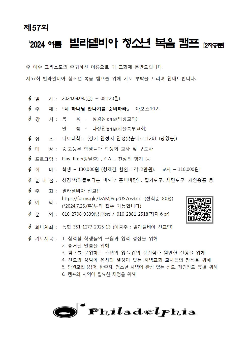 [캠프와 수련회] 제57회 빌라델비아 청소년 복음캠프[2차공문]