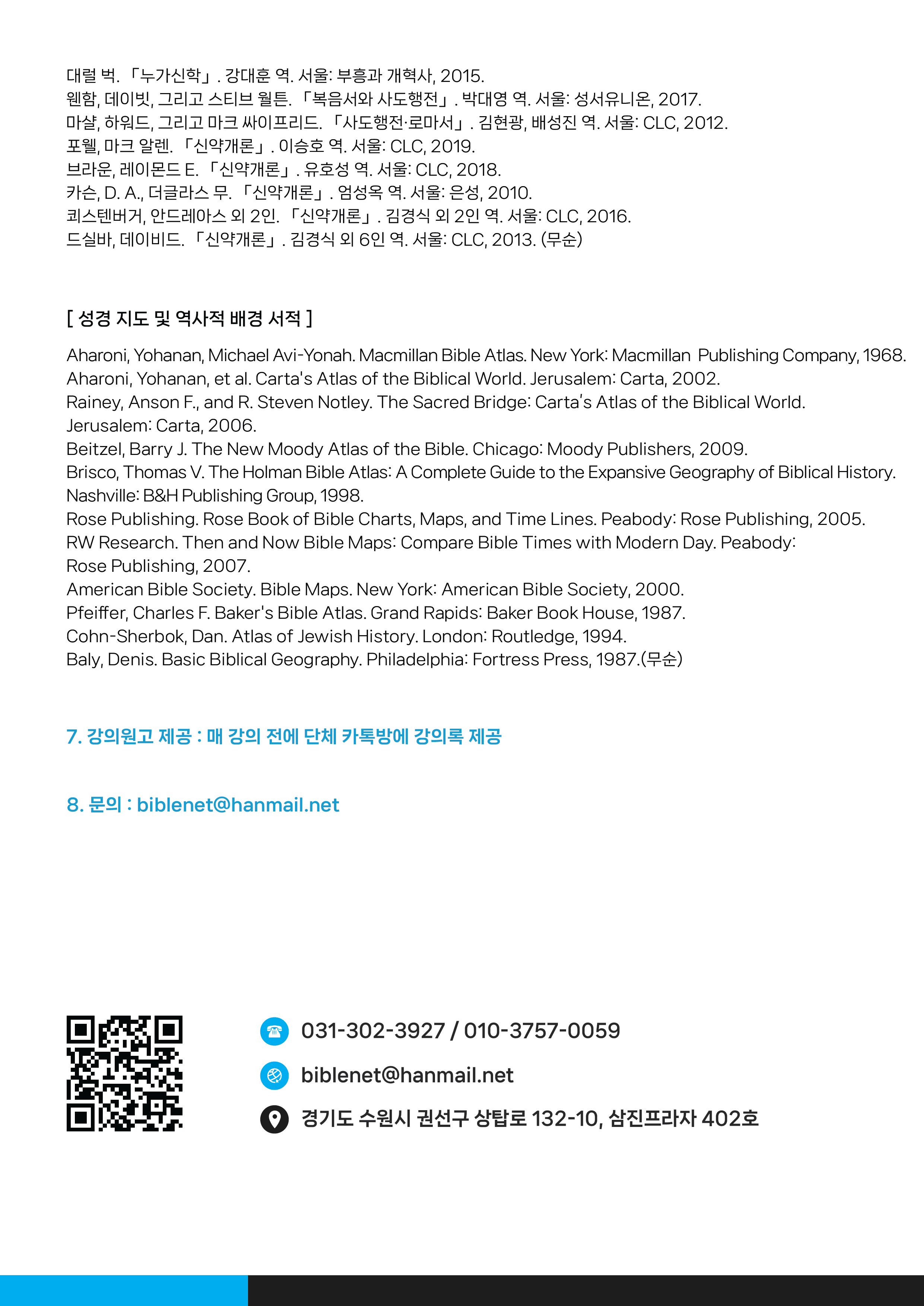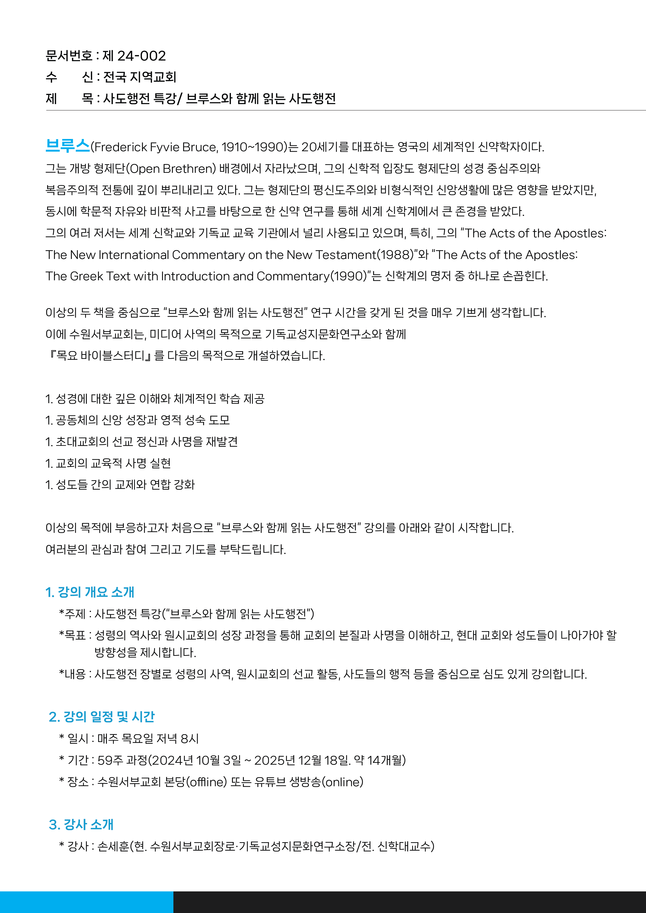 내용: 사도행전 장별로 성령의 사역, 원시교회의 선교 활동, 사도들의 행적 등을 중심으로 심도 있게 강의합니다.