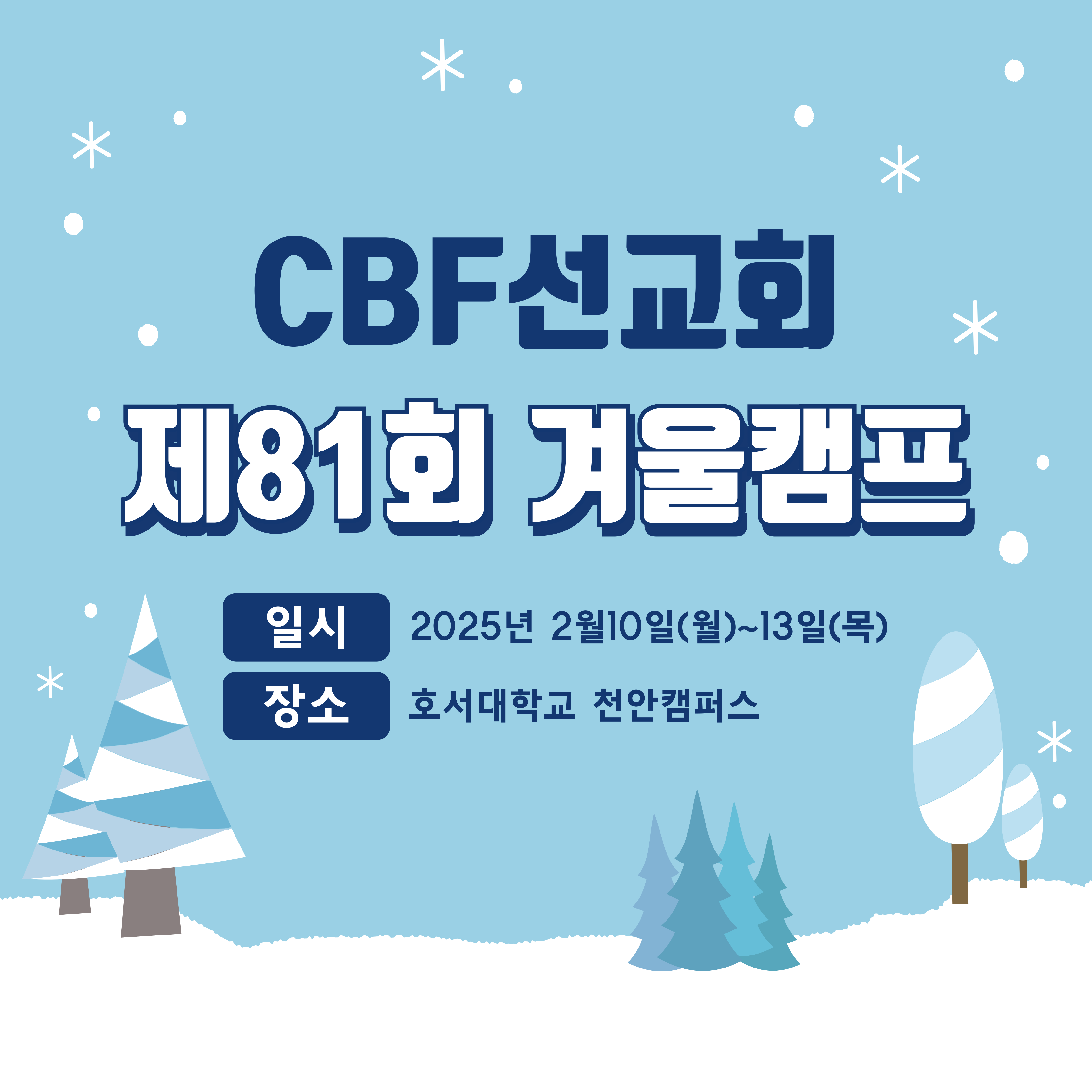 안녕하세요^^ 제81회 CBF선교회 겨울캠프가 2025년 2월 10일(월)~13일(목)에 지난 캠프와 동일하게 호서대학교 천안캠퍼스에서 개최됩니다. 자세한 내용은 추후에 다시 공지하겠습니다. 청년들의 많은 참여를 바랍니다.