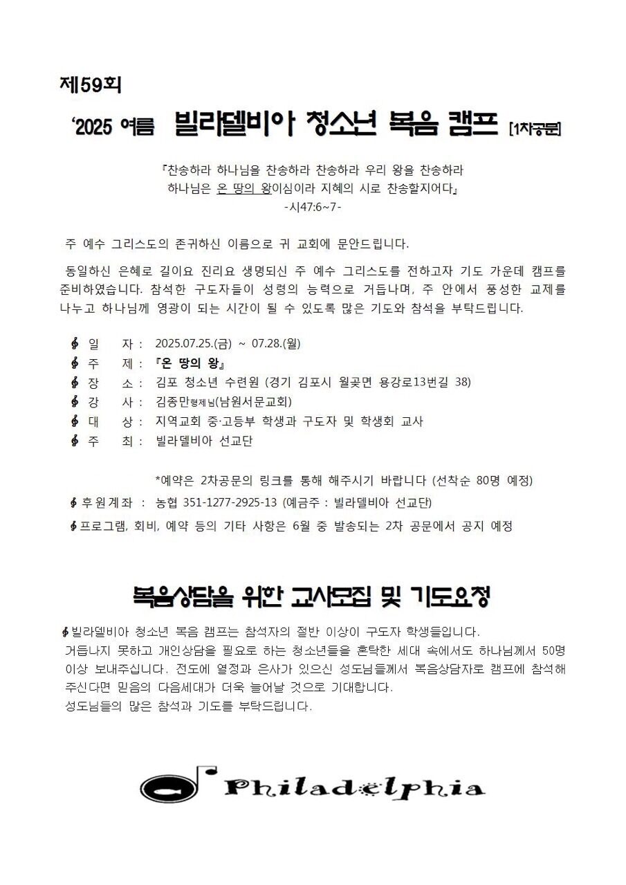 [캠프와 수련회] 빌라델비아 청소년 복음 캠프 (7월 25-28일)