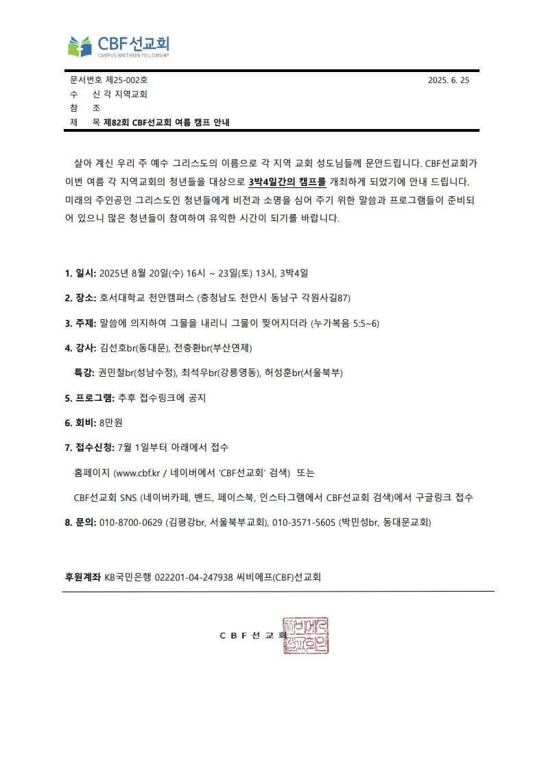 <제82회 CBF선교회 여름캠프 안내>