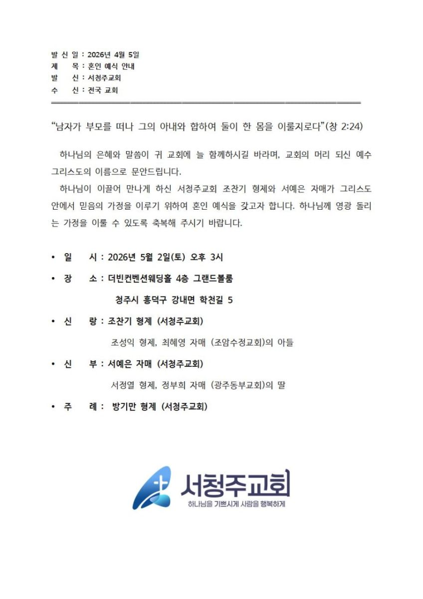 [기쁜소식] 조찬기형제, 서예은자매 (5월 2일)