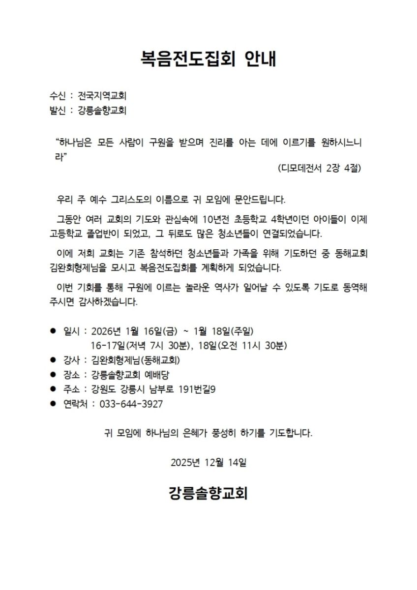 [복음집회] 강릉솔향교회 (1월 16-18일)