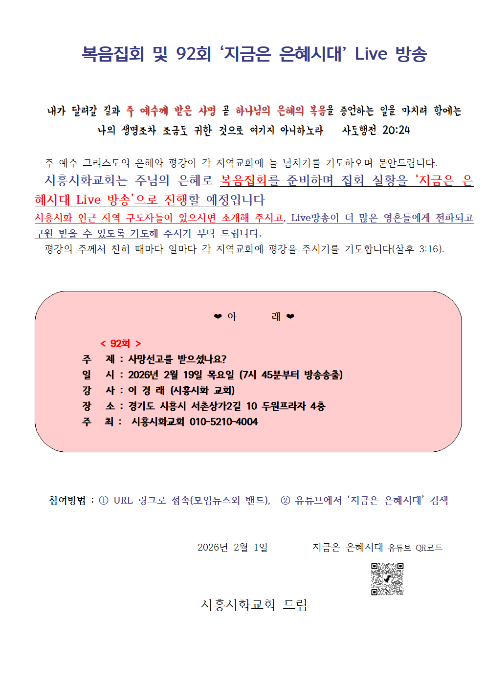[복음집회] 복음집회 및 92회 ‘지금은 은혜시대’ Live 방송