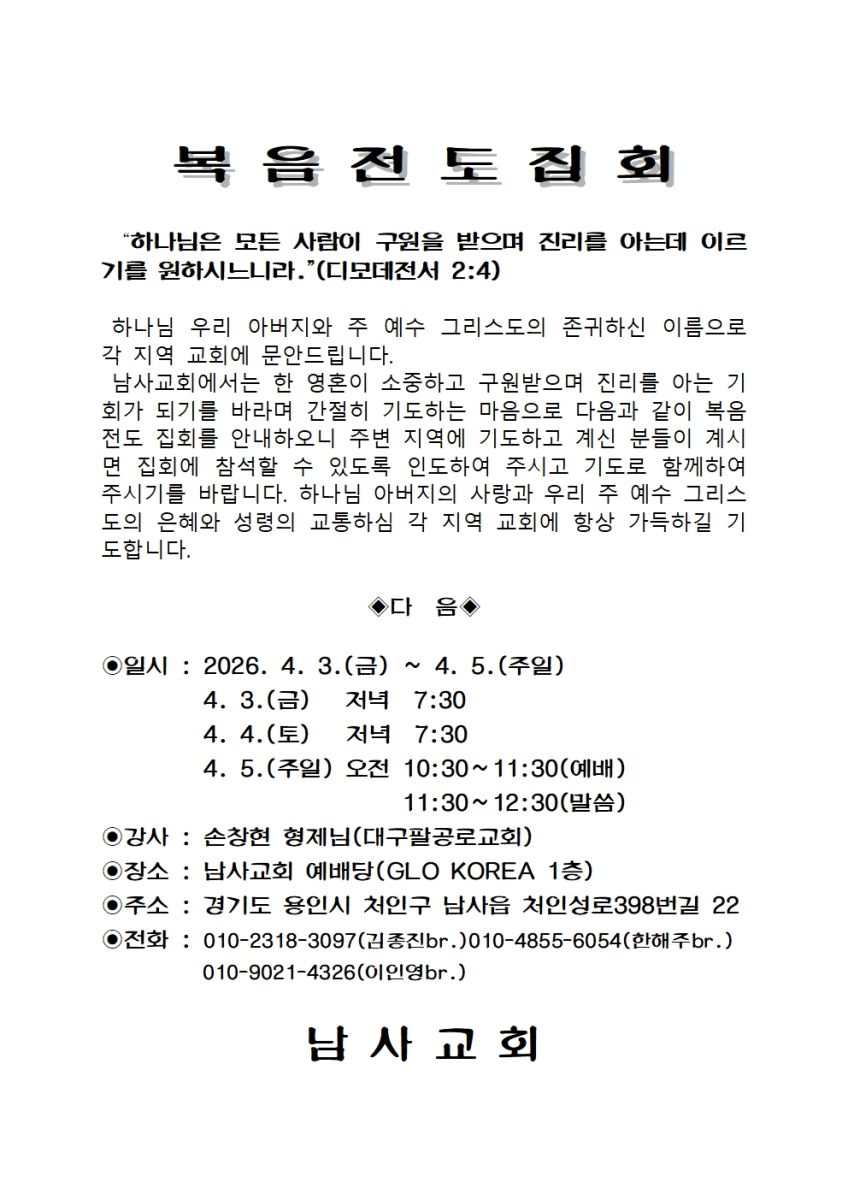 [복음집회] 남사교회 (4월 3-5일)