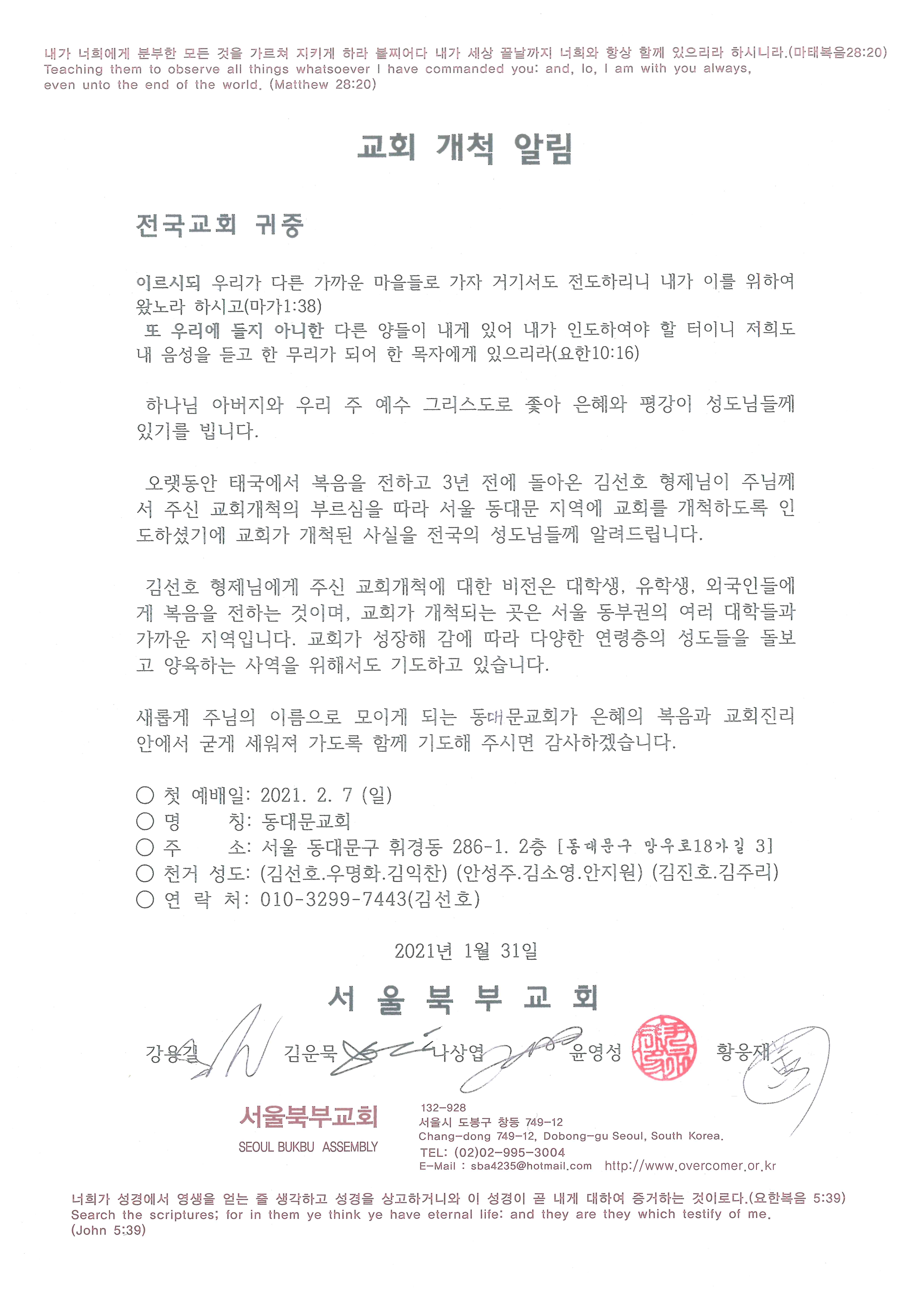 전국에 계시는 성도님들께서 새롭게 시작된 교회에 대해 관심과 기도로 함께해 주시기를 바라오며, 개척된 교회에 대한 안내는 첨부해 드리는 내용을 참고해 주시기 바랍니다.