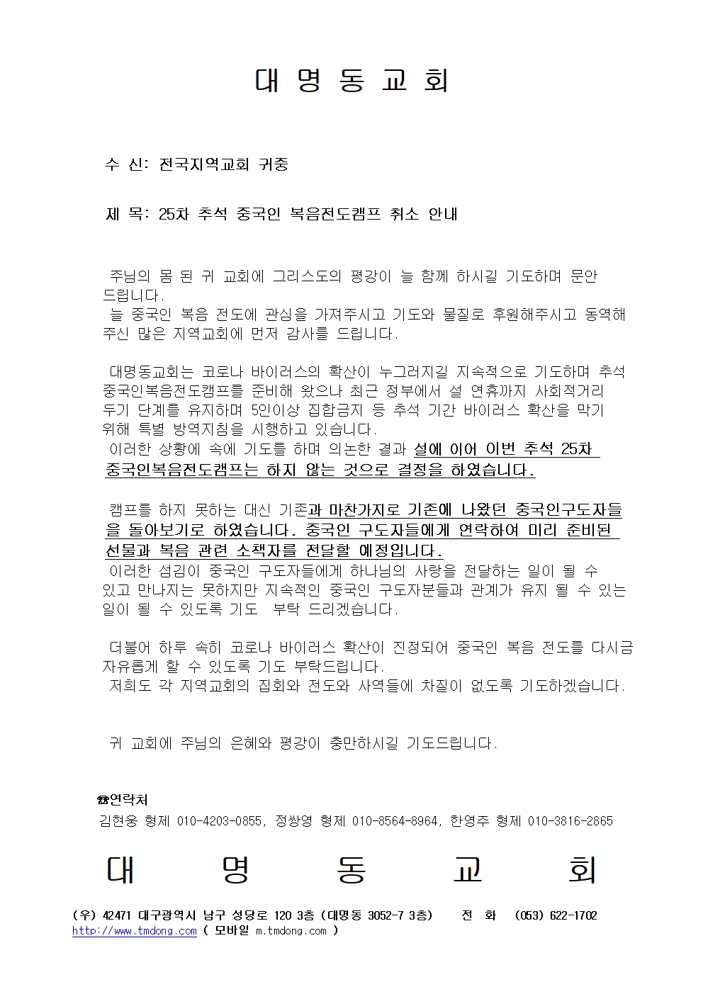 [지역교회] 대명동교회 추석 중국인복음전도캠프 취소 안내