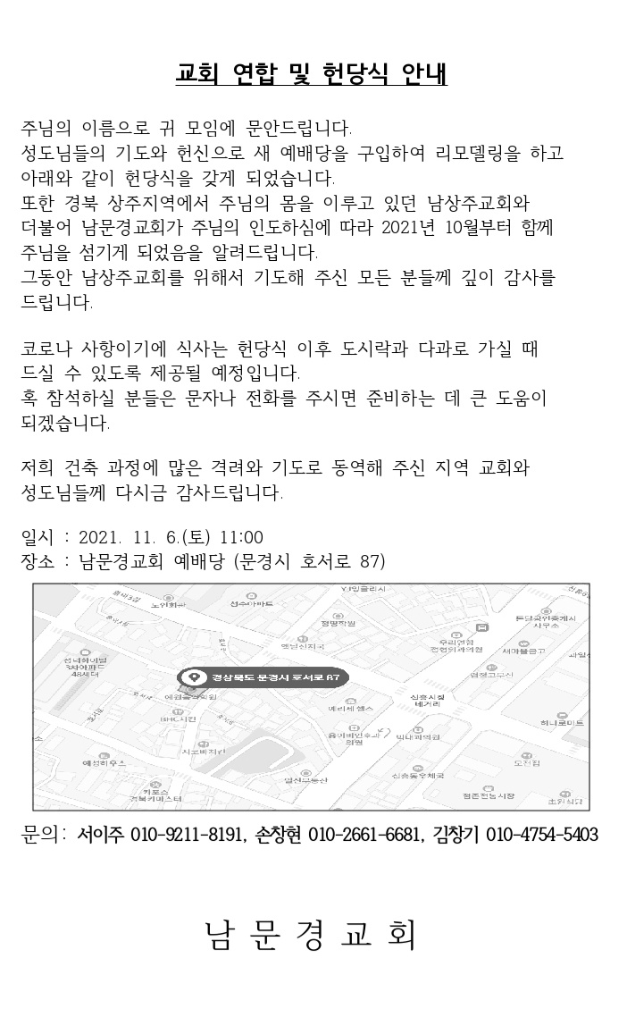 [지역교회] 교회 연합및 남문경교회 헌당식 안내 (11월 6일)