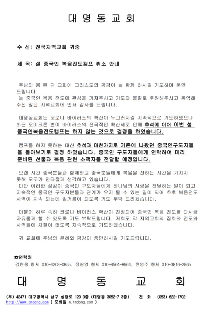 [지역교회] 대구 대명동교회 설 중국인복음전도 캠프 취소 안내