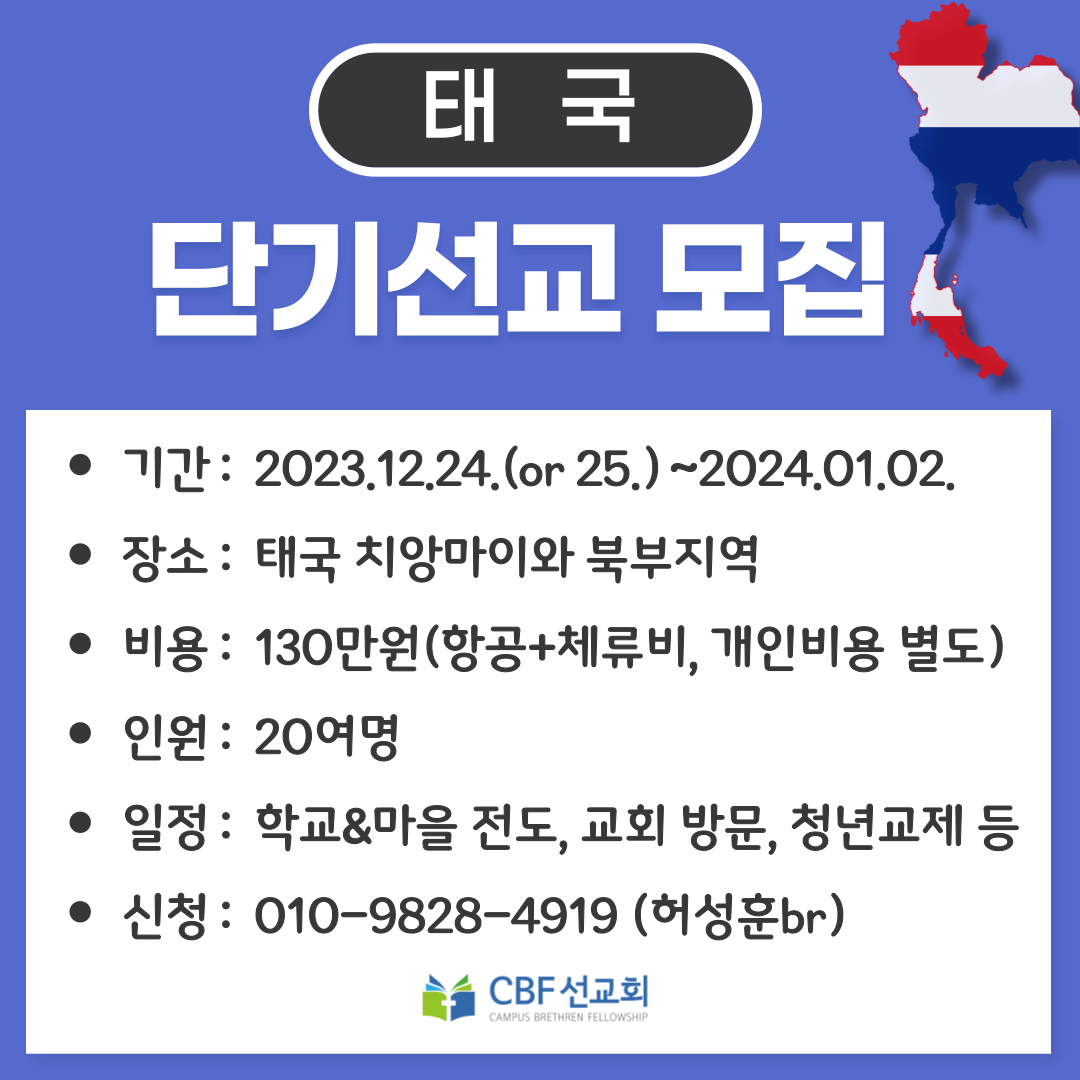 불교국가인 태국의 학교에서 크리스마스 기간에 복음을 전할 수 있는 기회가 열렸습니다. 다양한 은사를 활용(노래, 악기, 워십, 연극 등)하여 학생들에게 예수 그리스도를 전하고 태국의 교회와 성도님들을 방문하여 교제하는 시간을 갖고자 합니다. 전국 청년들 누구나 참여 가능하니 많은 신청을 바랍니다. 참고로 단기선교 시기가 연휴 기간이라 항공권예매를 서둘러야 하니 참여하고자 하는 청년들은 빠른 신청을 부탁드립니다.