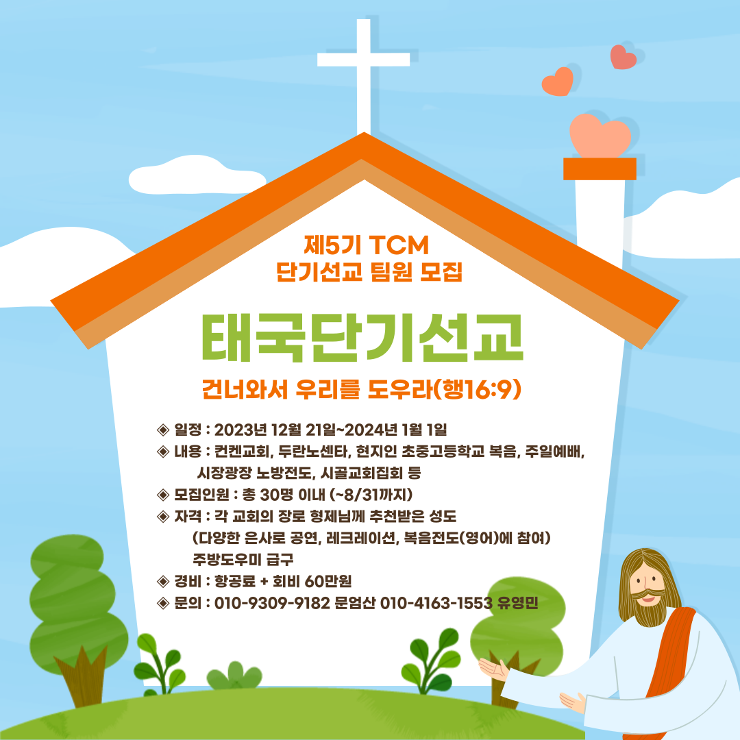 TCM 5기 단기선교팀을 모집합니다. 많은 기도와 참여를 부탁드립니다.