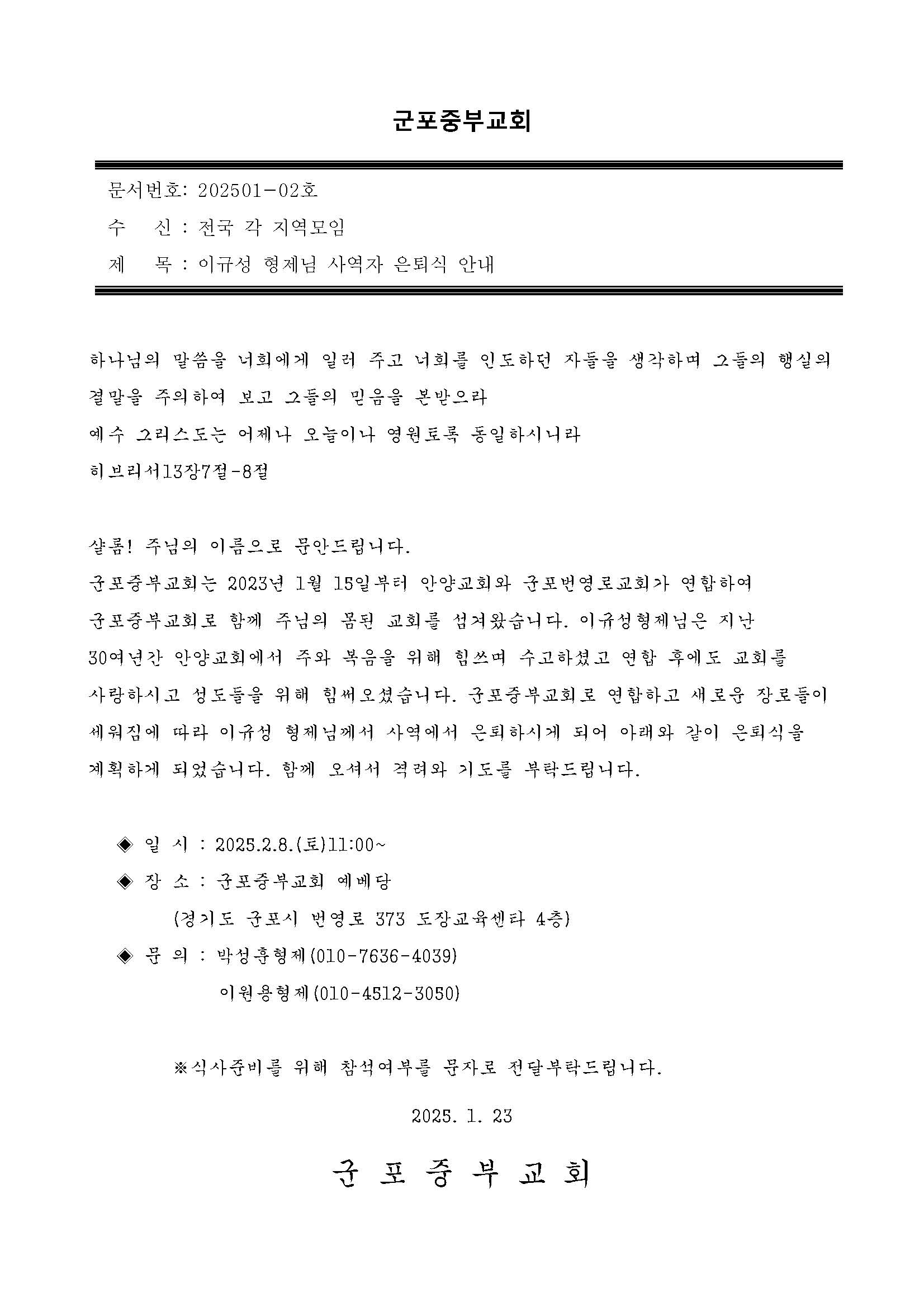 [지역교회] 군포중부교회 사역자(이규성형제님) 은퇴식 안내