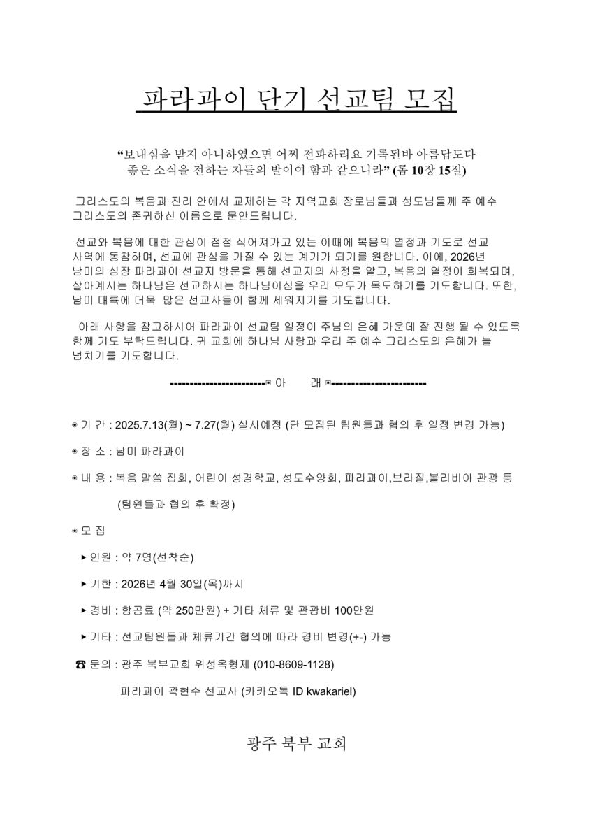 [선교] 파라과이 단기 선교팀 모집 (7월 13-27일)