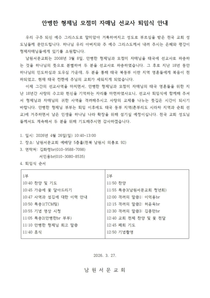 [선교] 안병한br(태국 컨켄교회) 선교사 퇴임식 : 4월 26일
