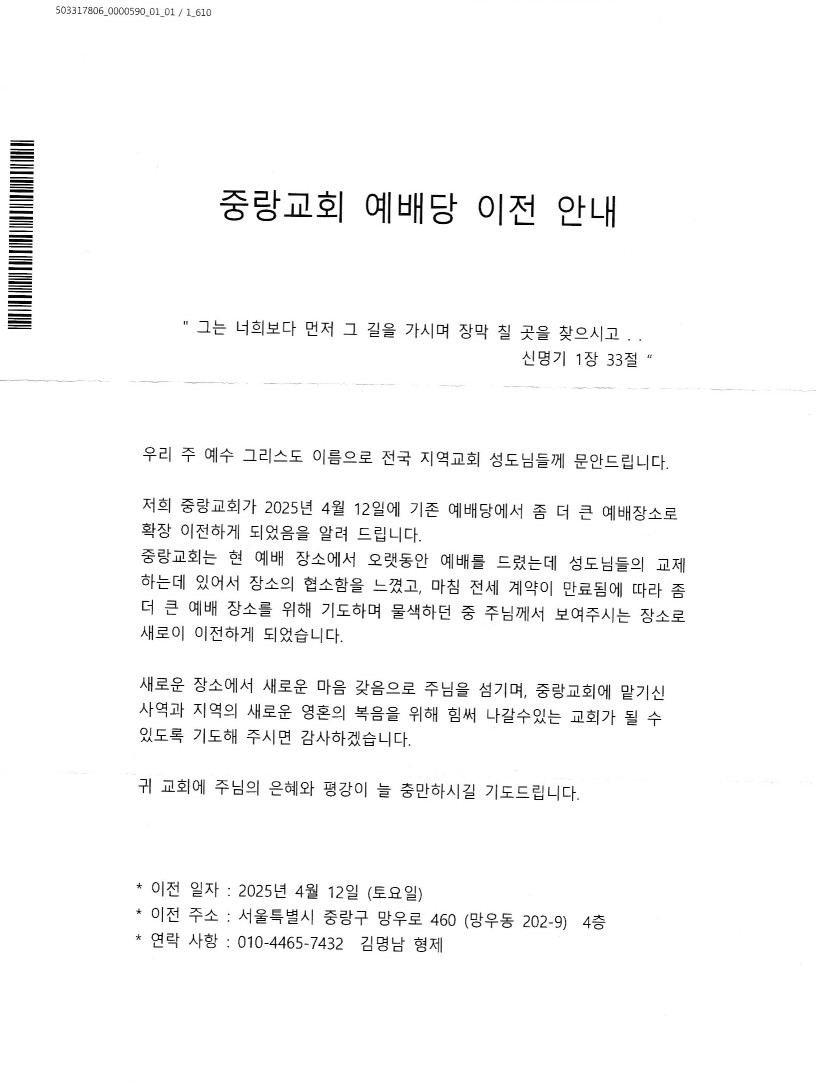 [지역교회] 중랑교회 예배당 이전 안내