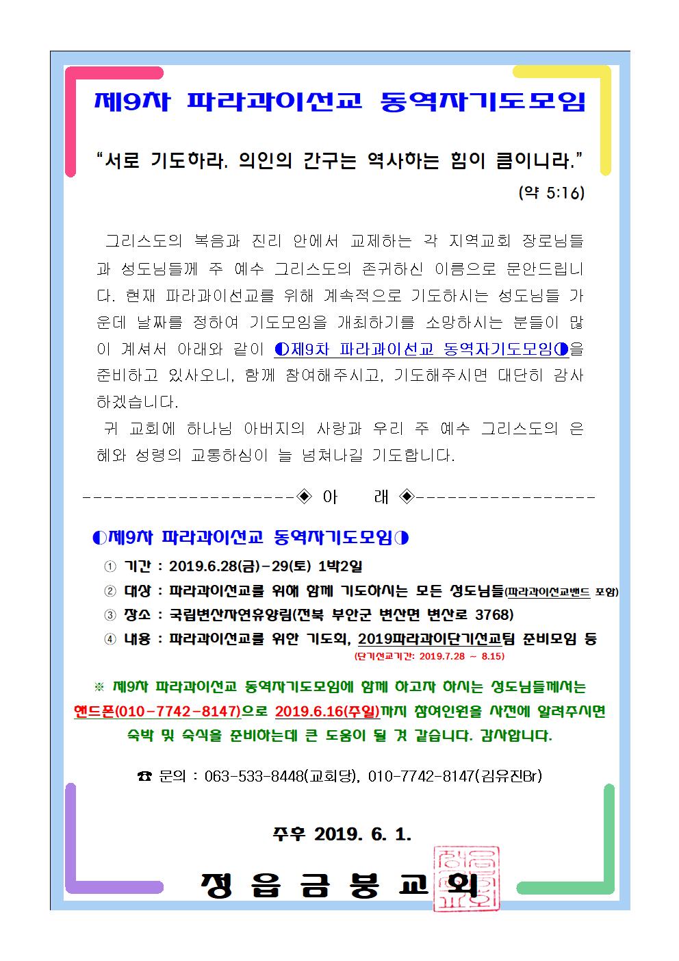 ⑤ 기타 : 제9차 파라과이선교 동역자기도모임에 함께 하고자 하시는 성도님들께서는 핸드폰(010-7742-8147. 김유진)으로 2019.6.16.(주일)까지 참여인원을 사전에 알려주시면 휴양림(숙박) 예약 및 식사를 준비하는데 큰 도움이 될 것 같습니다.