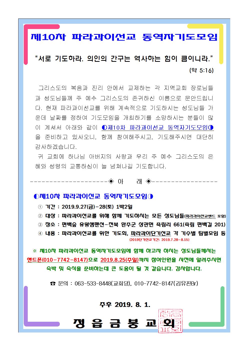 ⑤ 기타 : 제10차 파라과이선교 동역자기도모임에 함께 하고자 하시는 성도님들께서는 핸드폰(010-7742-8147. 김유진)으로 2019.8.25.(주일)까지 참여인원을 사전에 알려주시면 펜션(숙박) 예약 및 식사를 준비하는데 큰 도움이 될 것 같습니다.