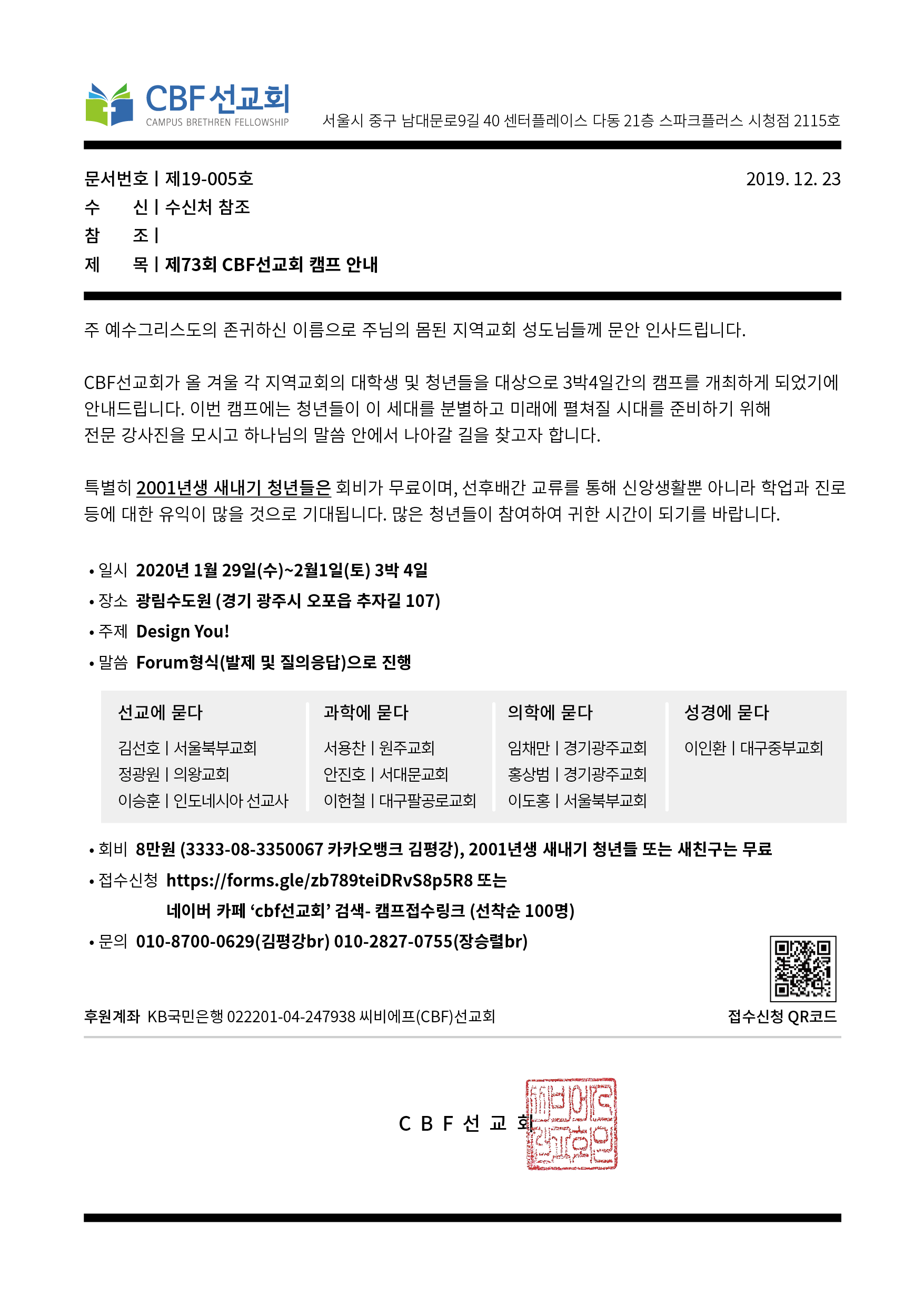 접수취소, 프로그램, 각종 공지 등 자세한 내용은 네이버 카페 "cbf선교회"와 추후 문자로 공지됩니다.