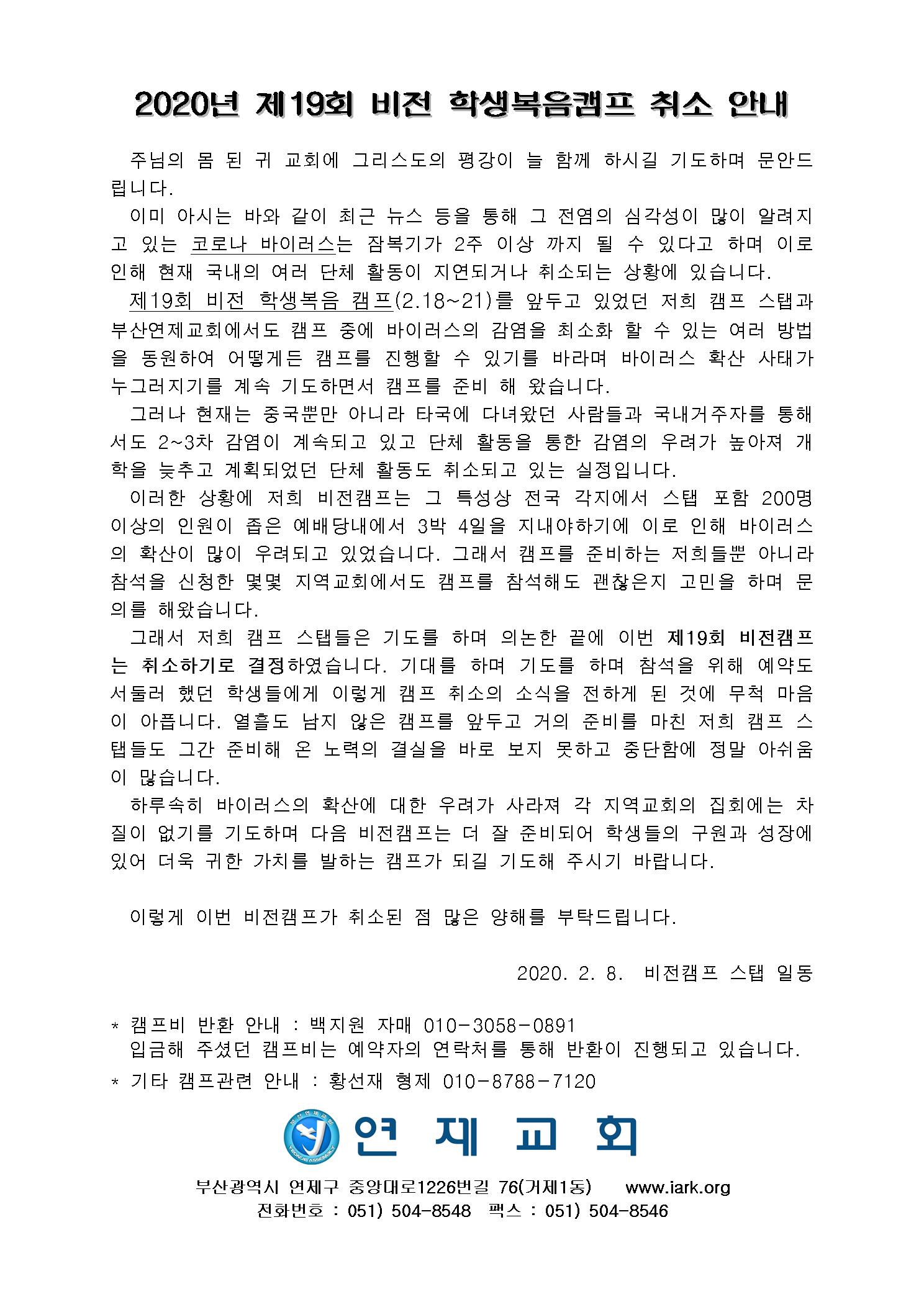 2020년 제19회 비전 학생복음캠프 취소 안내
