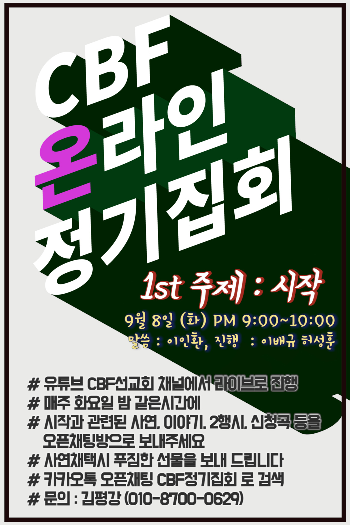코로나로 인해 2학기 CBF선교회 정기집회는 온라인으로 진행됩니다.