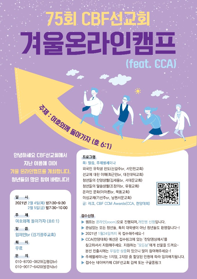 CBF선교회가 올 겨울 국내외 각 지역교회의 청년들(대학생 뿐 아니라 직장인 등 모든 청년)을 대상으로 2일간의 온라인 캠프(zoom)를 개최하게 되었기에 안내 드립니다.