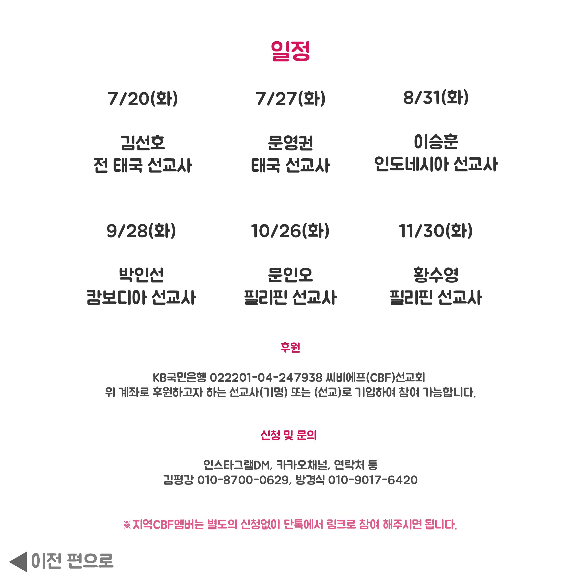 문의: 인스타 DM(CBF선교회 검색) 또는 010-8700-0629(김평강), 010-9017-6420(방경식)