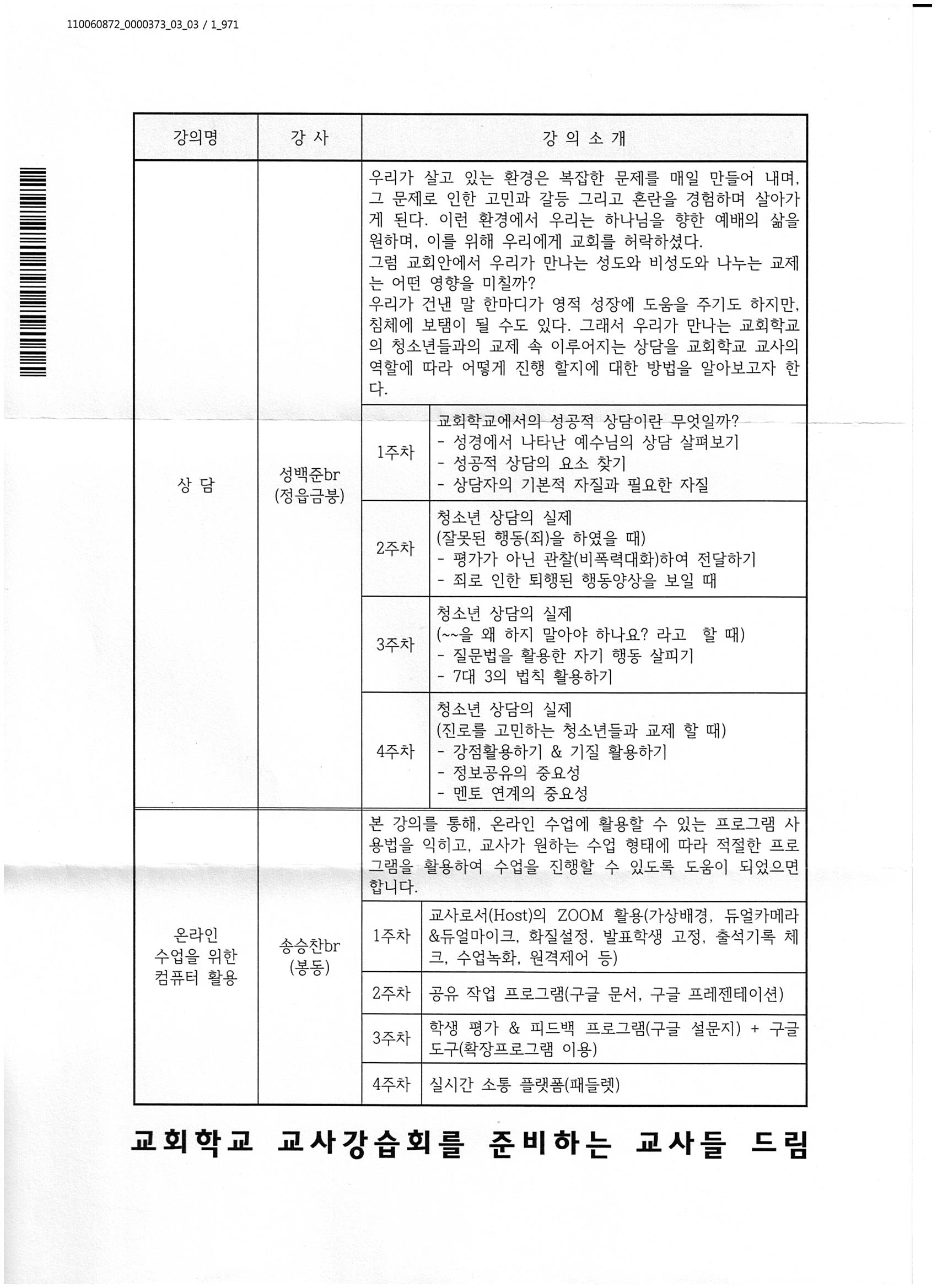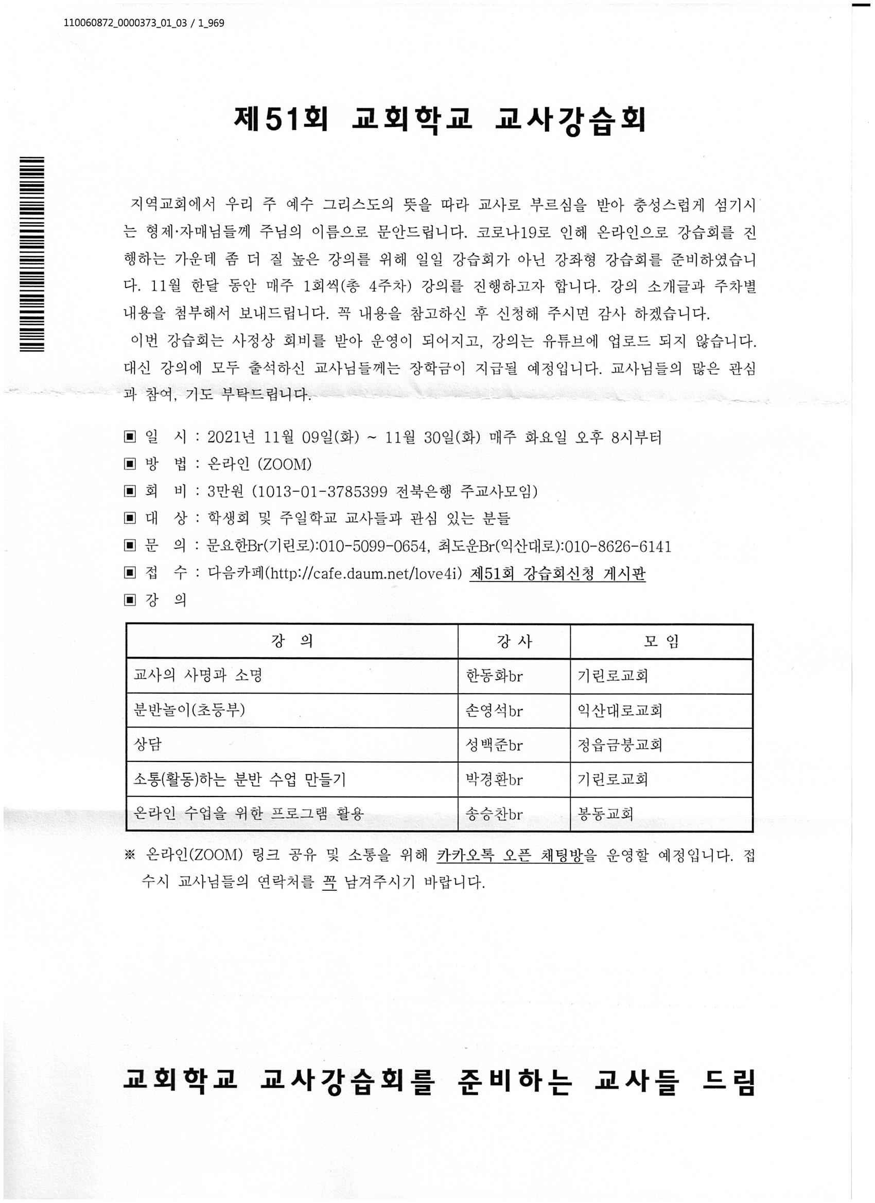 [강습과 세미나] 제 51회 교회학교 교사 강습회 (11월 9-30일)